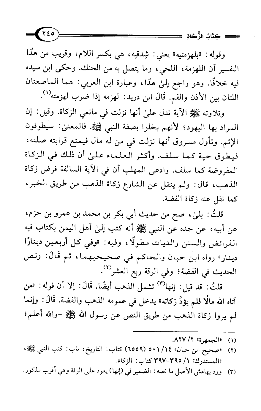 وتلاوته - صلى الله عليه وسلم - الآية تدل على أنها نزلت في مانعي الزكاة. وقيل: إن المراد بها اليهود؛ لأنهم بخلوا بصفة النبي - صلى الله عليه وسلم -. فالمعنى: سيطوقون الإثم. وتأول مسروق أنها نزلت في من له مال فيمنع قرابته صلته، فيطوق حية كما سلف. وأكثر العلماء على أن ذلك في الزكاة المفروضة كما سلف. وادعى المهلب أن في الآية السالفة فرض زكاة الذهب، قال: ولم ينقل عن الشارع زكاة الذهب من طريق الخبر، كما نقل عنه زكاة الفضة.