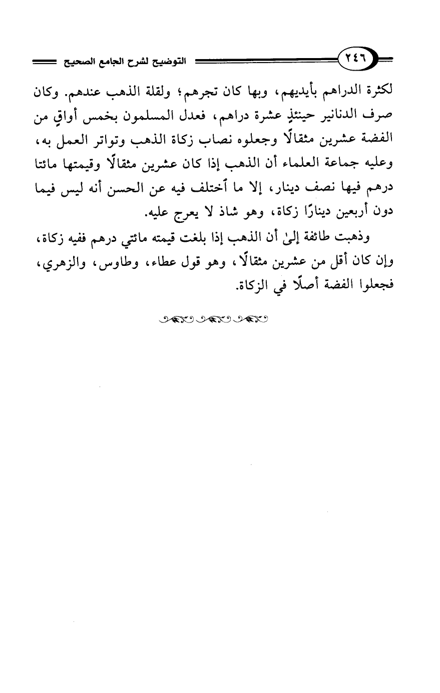 لكثرة الدراهم بأيديهم، وبها كان تجرهم؛ ولقلة الذهب عندهم. وكان صرف الدنانير حينئذٍ عشرة دراهم، فعدل المسلمون بخمس أواقٍ من الفضة عشرين مثقالًا وجعلوه نصاب زكاة الذهب وتواتر العمل به، وعليه جماعة العلماء أن الذهب إذا كان عشرين مثقالًا وقيمتها مائتا درهم فيها نصف دينار، إلا ما اختلف فيه عن الحسن أنه ليس فيما دون أربعين دينارًا زكاة، وهو شاذ لا يعرج عليه.