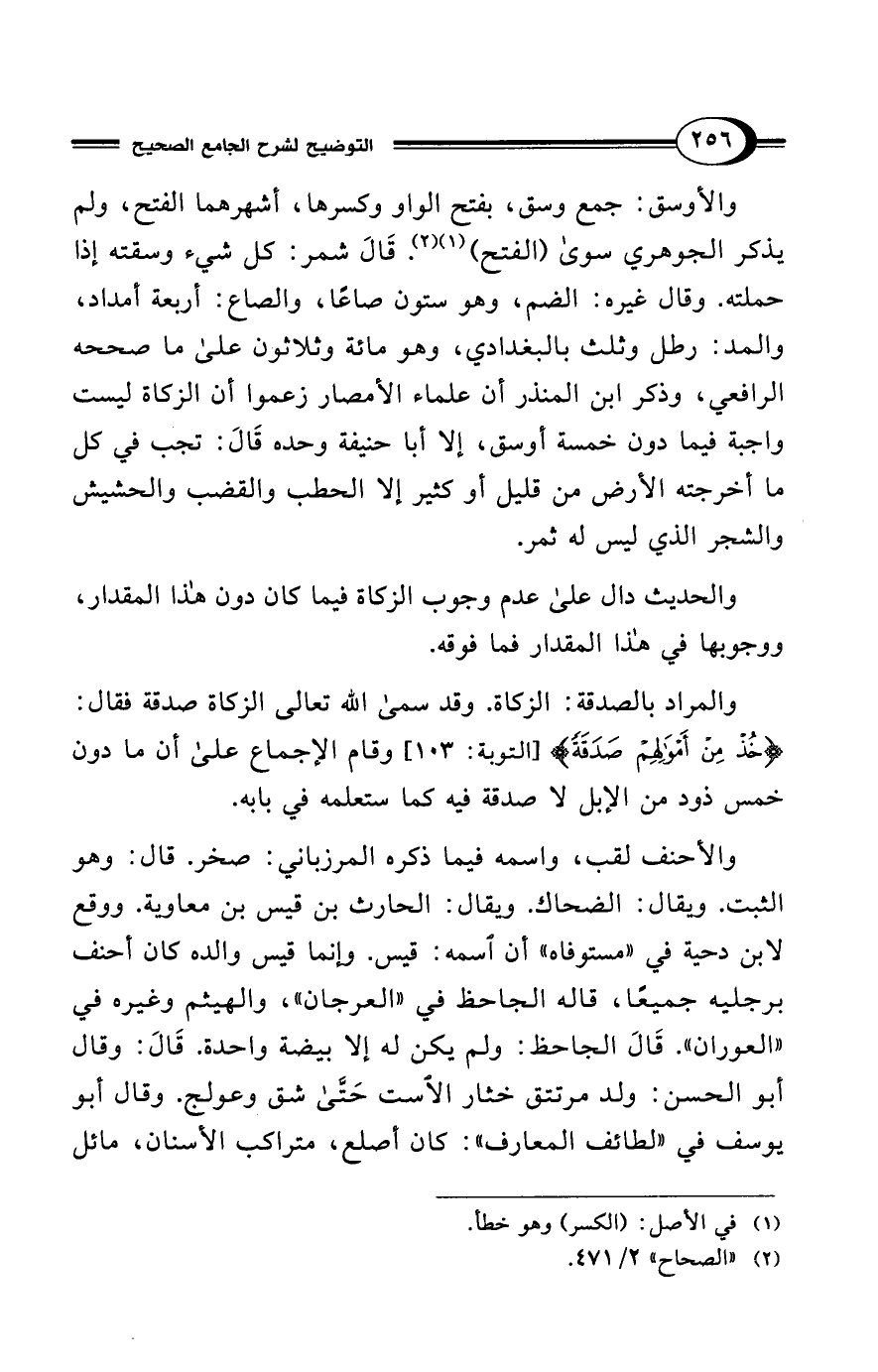 والأوسق: جمع وسق، بفتح الواو وكسرها، أشهرهما الفتح، ولم يذكر الجوهري سوى (الفتح) (¬1) (¬2).قَالَ شمر: كل شيء وسقته إذا حملته. وقال غيره: الضم، وهو ستون صاعًا، والصاع: أربعة أمداد، والمد: رطل وثلث بالبغدادي، وهو مائة وثلاثون على ما صححه الرافعي، وذكر ابن المنذر أن علماء الأمصار زعموا أن الزكاة ليست واجبة فيما دون خمسة أوسق، إلا أبا حنيفة وحده قَالَ: تجب في كل ما أخرجته الأرض من قليل أو كثير إلا الحطب والقضب والحشيش والشجر الذي ليس له ثمر.