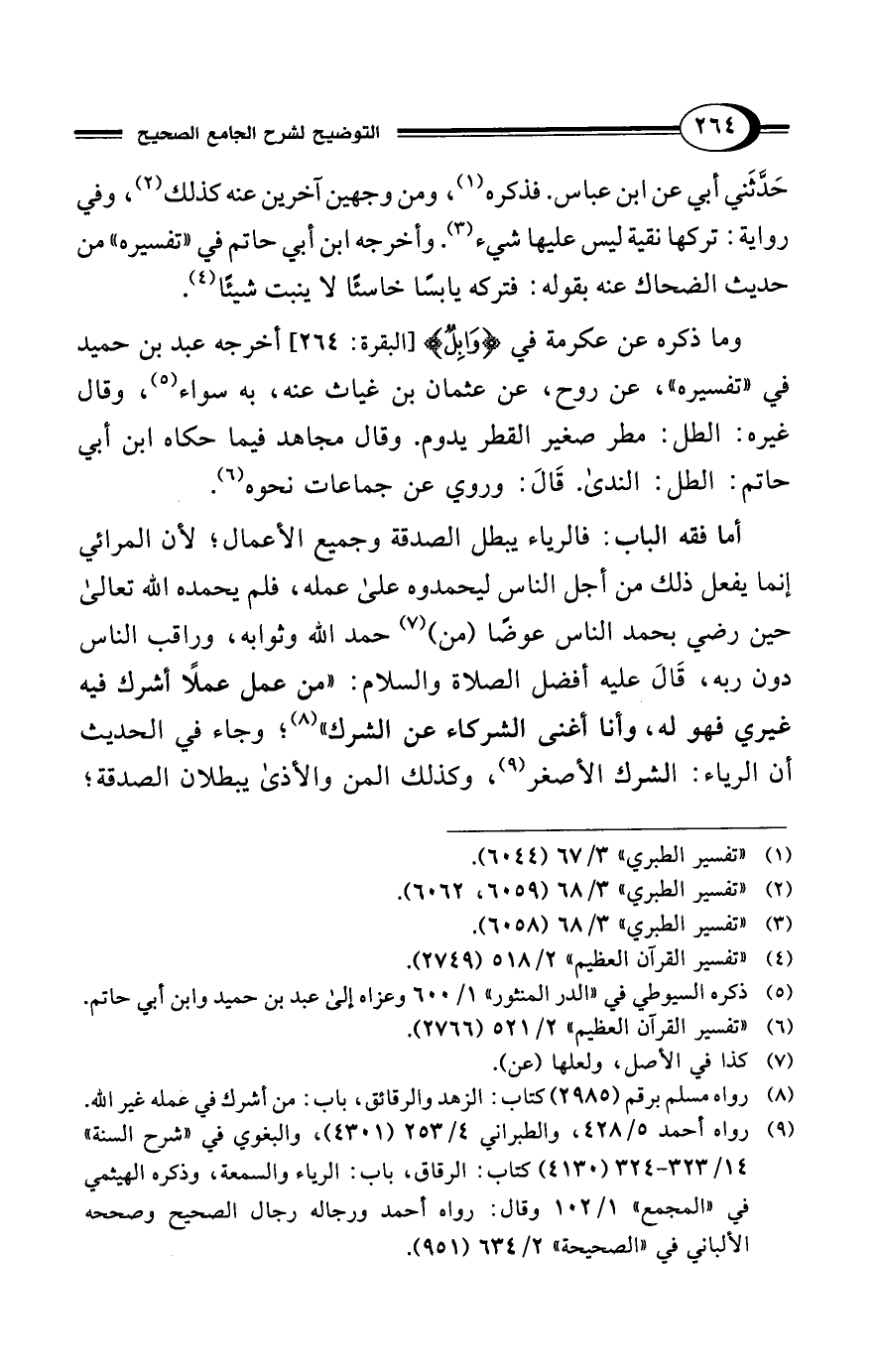 وما ذكره عن عكرمة في {وَابِلٌ} [البقرة: 264] أخرجه عبد بن حميد في "تفسيره"، عن روح، عن عثمان بن غياث عنه، به سواء (¬5)، وقال غيره: الطل: مطر صغير القطر يدوم. وقال مجاهد فيما حكاه ابن أبي حاتم: الطل: الندى. قَالَ: وروي عن جماعات نحوه (¬6).