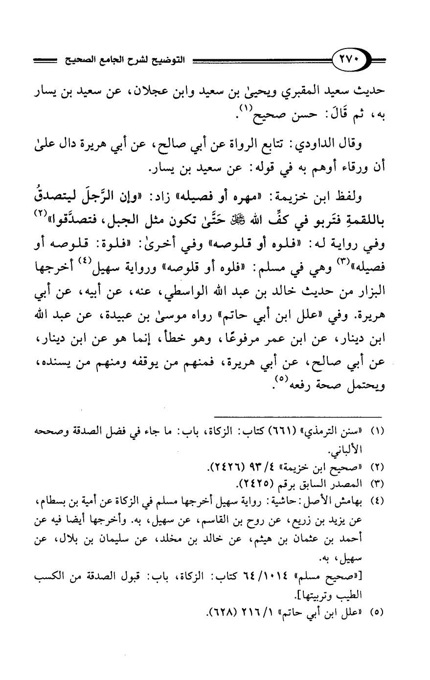 (¬4) بهامش الأصل: حاشية: رواية سهيل أخرجها مسلم في الزكاة عن أمية بن بسطام، عن يزيد بن زريع، عن روح بن القاسم، عن سهيل، به. وأخرجها أيضًا فيه عن أحمد بن عثمان بن هيثم، عن خالد بن مخلد، عن سليمان بن بلال، عن سهيل، به.