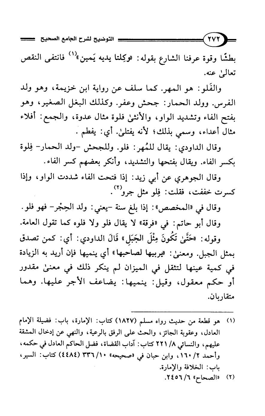 وقال الداودي: يقال للمُهر: فلو. وللجحش -ولد الحمار- فِلوة بكسر الفاء. ويقال بفتحها والتشديد، وأنكر بعضهم كسر الفاء.