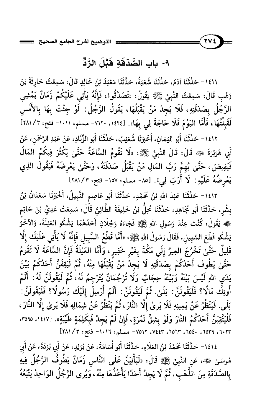 1412 - حَدَّثَنَا أَبُو اليَمَانِ، أَخْبَرَنَا شُعَيْبٌ، حَدَّثَنَا أَبُو الزِّنَادِ، عَنْ عَبْدِ الرَّحْمَنِ، عَنْ أَبِي هُرَيْرَةَ - رضي الله عنه - قَالَ: قَالَ النَّبِيُّ - صلى الله عليه وسلم -: "لاَ تَقُومُ السَّاعَةُ حَتَّى يَكْثُرَ فِيكُمُ المَالُ فَيَفِيضَ، حَتَّى يُهِمَّ رَبَّ المَالِ مَنْ يَقْبَلُ صَدَقَتَهُ، وَحَتَّى يَعْرِضَهُ فَيَقُولَ الذِي يَعْرِضُهُ عَلَيْهِ: لَا أَرَبَ لِي". [85 - مسلم: 157 - فتح: 3/ 281]