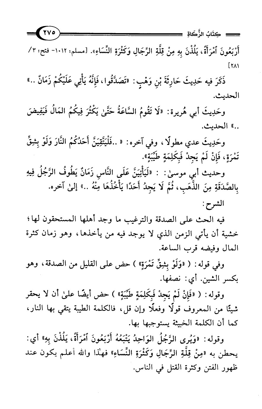 وحديث أبي موسى: "لَيَأْتِيَنَّ عَلَى النَّاسِ زَمَانٌ يَطُوفُ الرَّجُلُ فِيهِ بِالصَّدَقَةِ مِنَ الذَّهَبِ، ثُمَّ لَا يَجِدُ أَحَدًا يَأْخُذُهَا مِنْهُ .. " إلى آخره.