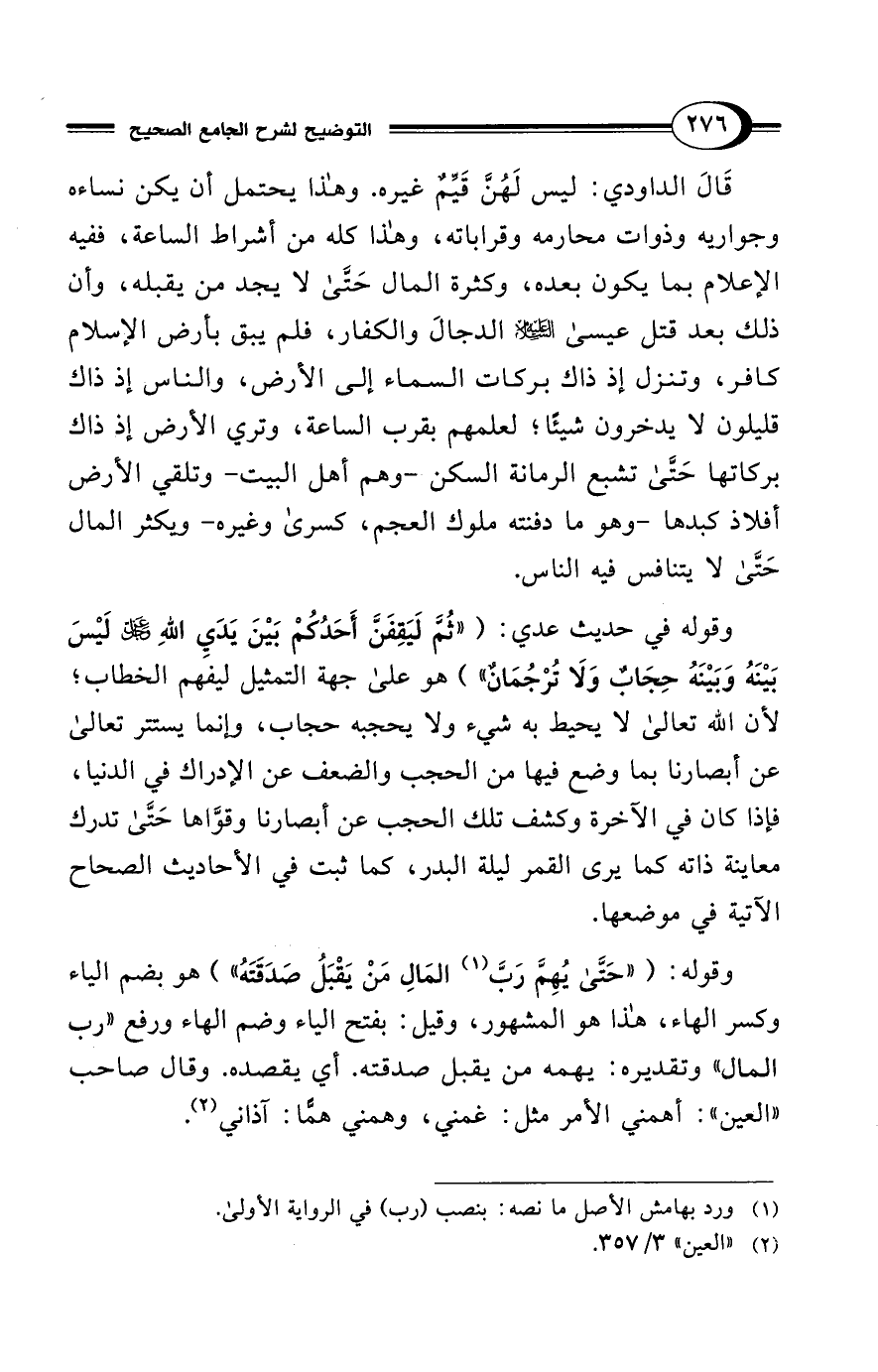 وقوله في حديث عدي: ("ثُمَّ لَيَقِفَنَّ أَحَدُكُمْ بَيْنَ يَدَي اللهِ -عز وجل- لَيْسَ بَيْنَهُ وَبَيْنَهُ حِجَابٌ وَلَا تُرْجُمَان") هو على جهة التمثيل ليفهم الخطاب؛ لأن الله تعالى لا يحيط به شيء ولا يحجبه حجاب، وإنما يستتر تعالى عن أبصارنا بما وضع فيها من الحجب والضعف عن الإدراك في الدنيا، فإذا كان في الآخرة وكشف تلك الحجب عن أبصارنا وقوَّاها حَتَّى تدرك معاينة ذاته كما يرى القمر ليلة البدر، كما ثبت في الأحاديث الصحاح الآتية في موضعها.