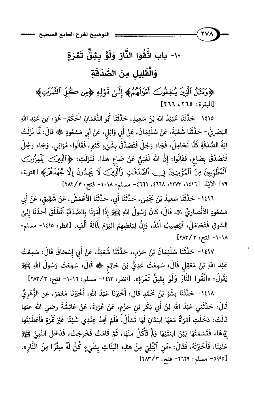 1417 - حَدَّثَنَا سُلَيْمَانُ بْنُ حَرْبٍ، حَدَّثَنَا شُعْبَةُ عَنْ أَبِي إِسْحَاقَ قَالَ: سَمِعْتُ عَبْدَ اللهِ بْنَ مَعْقِلٍ قَالَ: سَمِعْتُ عَدِيَّ بْنَ حَاتِمٍ - رضي الله عنه - قَالَ: سَمِعْتُ رَسُولَ اللهِ - صلى الله عليه وسلم - يَقُولُ: "اتَّقُوا النَّارَ وَلَوْ بِشِقِّ تَمْرَةٍ". [انظر: 1413 - مسلم: 1016 - فتح: 3/ 283]