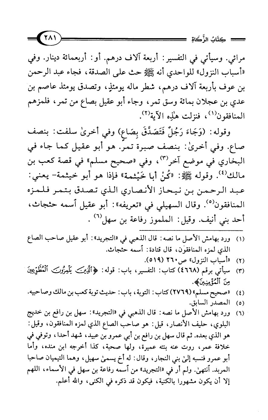(¬6) ورد بهامش الأصل ما نصه: قال الذهبي في "التجريد": سهل بن رافع بن خديج البلوي، حليف الأنصار، قيل: هو صاحب الصاع الذي لمزه المنافقون، وقيل: هو الذي بعده. ثم قال سهل بن رافع بن أبي عمرو بن عبيد، شهد أحدا، وتوفي في خلافة عمر، روت عنه بنته عميرة، ولها صحبة، كذا أخرجه ابن منده، وأما أبو عمرو فنسبه إلى بني النجار، وقال: له أخ يسمى سهيل، وهما التيميان صاحبا المربد. انتهى. ولم أر في "التجريد" من اسمه رفاعة بن سهل في الأسماء، اللهم إلا أن يكون مشهورا بالكنية، فيكون قد ذكره في الكنى، والله أعلم.