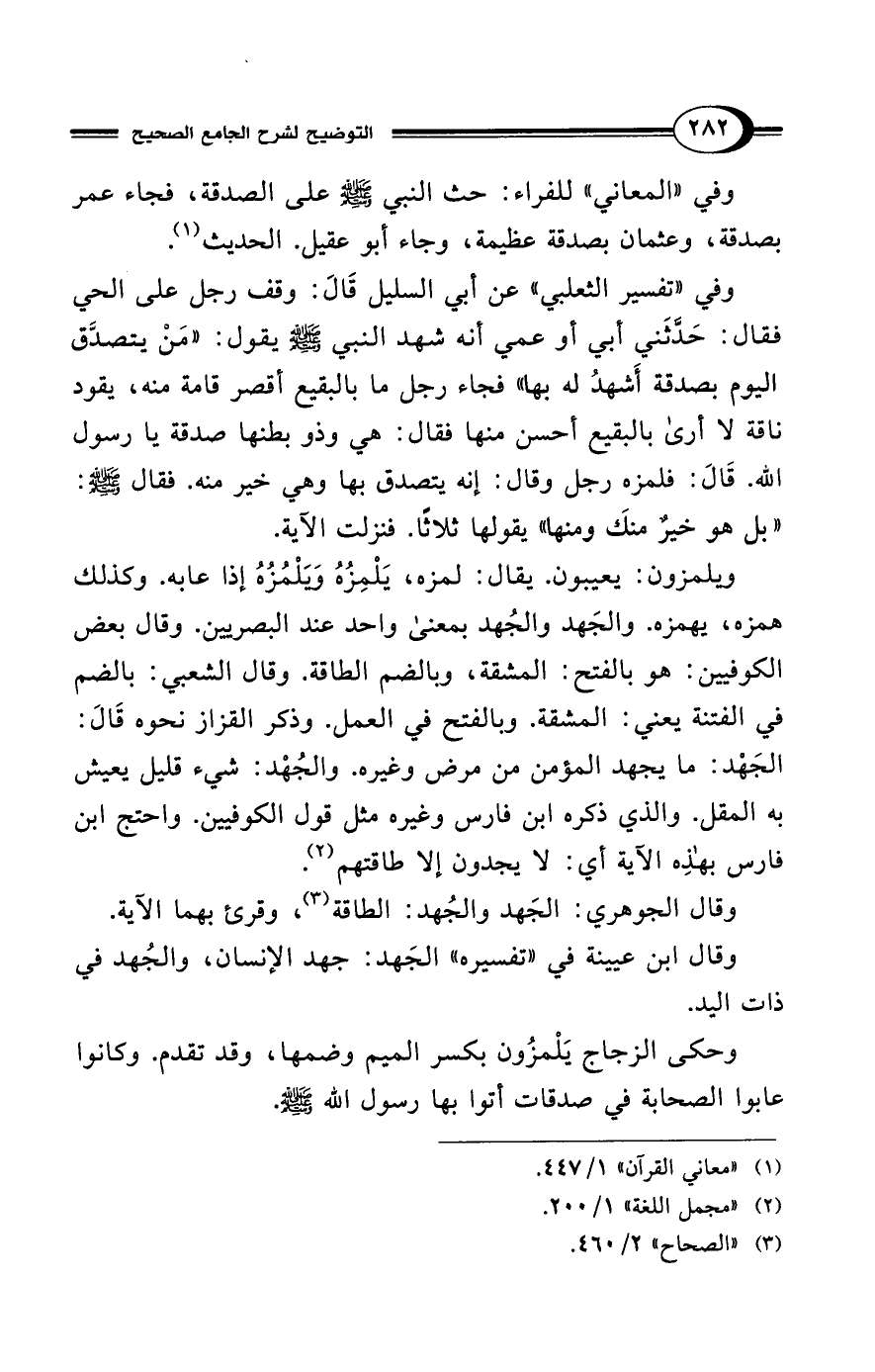 ويلمزون: يعيبون. يقال: لمزه، يَلْمِزُهُ وَيَلْمُزُهُ إذا عابه. وكذلك همزه، يهمزه. والجَهد والجُهد بمعنى واحد عند البصريين. وقال بعض الكوفيين: هو بالفتح: المشقة، وبالضم الطاقة. وقال الشعبي: بالضم في الفتنة يعني: المشقة. وبالفتح في العمل. وذكر القزاز نحوه قَالَ: الجَهْد: ما يجهد المؤمن من مرض وغيره. والجُهْد: شيء قليل يعيش به المقل. والذي ذكره ابن فارس وغيره مثل قول الكوفيين. واحتج ابن فارس بهذِه الآية أي: لا يجدون إلا طاقتهم (¬2).