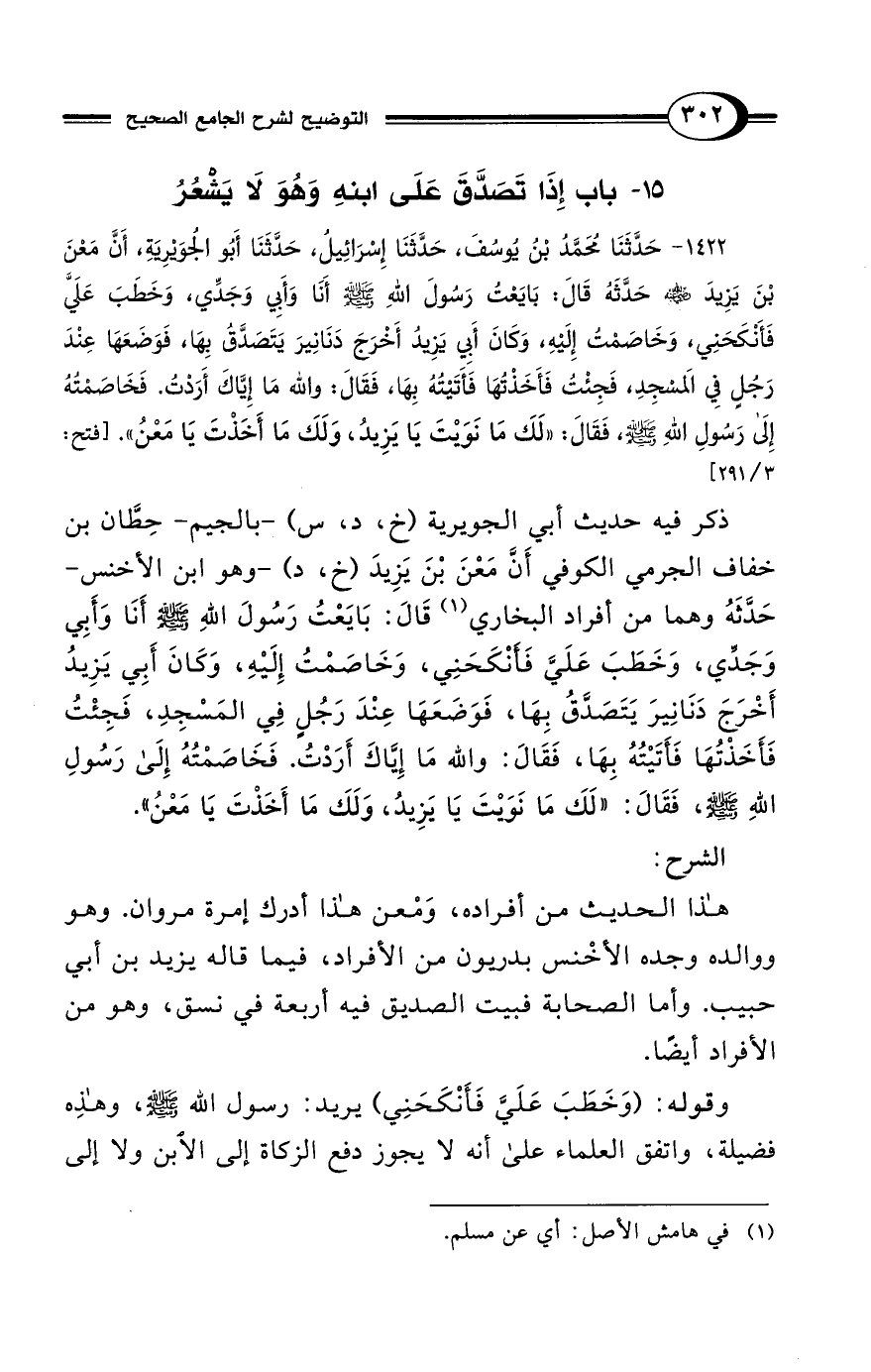 1422 - حَدَّثَنَا مُحَمَّدُ بْنُ يُوسُفَ، حَدَّثَنَا إِسْرَائِيلُ، حَدَّثَنَا أَبُو الجُوَيْرِيَةِ، أَنَّ مَعْنَ بْنَ يَزِيدَ - رضي الله عنه - حَدَّثَهُ قَالَ: بَايَعْتُ رَسُولَ اللهِ - صلى الله عليه وسلم - أَنَا وَأَبِي وَجَدِّي، وَخَطَبَ عَلَيَّ فَأَنْكَحَنِي، وَخَاصَمْتُ إِلَيْهِ، وَكَانَ أَبِي يَزِيدُ أَخْرَجَ دَنَانِيرَ يَتَصَدَّقُ بِهَا، فَوَضَعَهَا عِنْدَ رَجُلٍ فِي المَسْجِدِ، فَجِئْتُ فَأَخَذْتُهَا فَأَتَيْتُهُ بِهَا، فَقَالَ: وَاللهِ مَا إِيَّاكَ أَرَدْتُ. فَخَاصَمْتُهُ إِلَى رَسُولِ اللهِ - صلى الله عليه وسلم -، فَقَالَ: "لَكَ مَا نَوَيْتَ يَا يَزِيدُ، وَلَكَ مَا أَخَذْتَ يَا مَعْنُ". [فتح: 3/ 291]