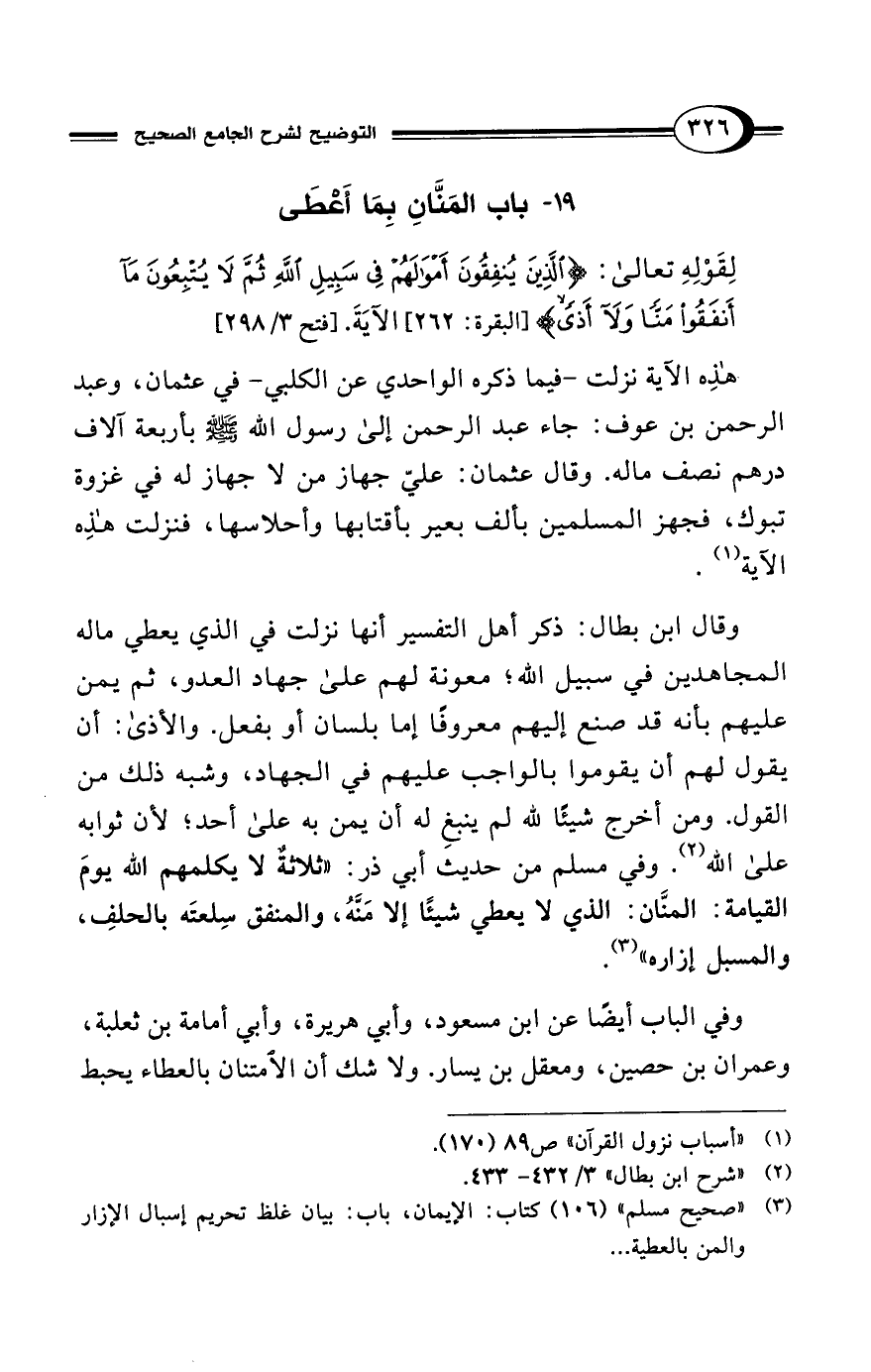 وقال ابن بطال: ذكر أهل التفسير أنها نزلت في الذي يعطي ماله المجاهدين في سبيل الله؛ معونة لهم على جهاد العدو، ثم يمن عليهم بأنه قد صنع إليهم معروفًا إما بلسان أو بفعل. والأذى: أن يقول لهم أن يقوموا بالواجب عليهم في الجهاد، وشبه ذلك من القول. ومن أخرج شيئًا لله لم ينبغِ له أن يمن به على أحد؛ لأن ثوابه على الله (¬2). وفي مسلم من حديث أبي ذر: "ثلاثةٌ لا يكلمهم الله يومَ القيامة: المنَّان: الذي لا يعطي شيئًا إلا مَنَّهُ، والمنفق سِلعتَه بالحلفِ، والمسبل إزاره" (¬3).
