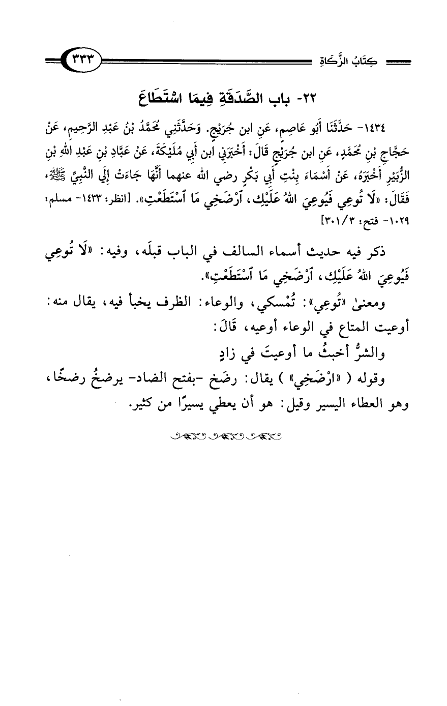 1434 - حَدَّثَنَا أَبُو عَاصِمٍ، عَنِ ابْنِ جُرَيْجٍ. وَحَدَّثَنِي مُحَمَّدُ بْنُ عَبْدِ الرَّحِيمِ، عَنْ حَجَّاجِ بْنِ مُحَمَّدٍ، عَنِ ابْنِ جُرَيْجٍ قَالَ: أَخْبَرَنِي ابْنُ أَبِي مُلَيْكَةَ، عَنْ عَبَّادِ بْنِ عَبْدِ اللهِ بْنِ الزُّبَيْرِ أَخْبَرَهُ، عَنْ أَسْمَاءَ بِنْتِ أَبِي بَكْرٍ رضي الله عنهما أَنَّهَا جَاءَتْ إِلَي النَّبِيِّ - صلى الله عليه وسلم - فَقَالَ: "لاَ تُوعِي فَيُوعِىَ اللهُ عَلَيْكِ، ارْضَخِي مَا اسْتَطَعْتِ". [انظر: 1433 - مسلم: 1029 - فتح: 3/ 301]