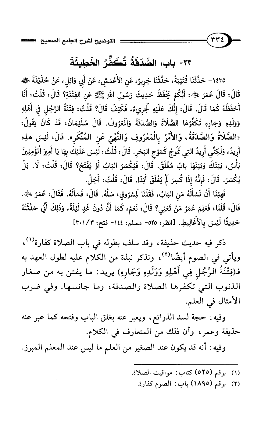 1435 - حَدَّثَنَا قُتَيْبَةُ، حَدَّثَنَا جَرِيرٌ، عَنِ الأَعْمَشِ، عَنْ أَبِي وَائِلٍ، عَنْ حُذَيْفَةَ - رضي الله عنه - قَالَ: قَالَ عُمَرُ - رضي الله عنه -: أَيُّكُمْ يَحْفَظُ حَدِيثَ رَسُولِ اللهِ - صلى الله عليه وسلم - عَنِ الفِتْنَةِ؟ قَالَ: قُلْتُ: أَنَا أَحْفَظُهُ كَمَا قَالَ. قَالَ: إِنَّكَ عَلَيْهِ لَجَرِيءٌ، فَكَيْفَ قَالَ؟ قُلْتُ: فِتْنَةُ الرَّجُلِ فِي أَهْلِهِ وَوَلَدِهِ وَجَارِهِ تُكَفِّرُهَا الصَّلاَةُ وَالصَّدَقَةُ وَالمَعْرُوفُ. قَالَ سُلَيْمَانُ: قَدْ كَانَ يَقُولُ: "الصَّلاَةُ وَالصَّدَقَةُ، وَالأَمْرُ بِالمَعْرُوفِ وَالنَّهْىُ عَنِ المُنْكَرِ". قَالَ: لَيْسَ هَذِهِ أُرِيدُ، وَلَكِنِّي أُرِيدُ التِي تَمُوجُ كَمَوْجِ البَحْرِ. قَالَ: قُلْتُ: لَيْسَ عَلَيْكَ بِهَا يَا أَمِيرَ المُؤْمِنِينَ بَأْسٌ، بَيْنَكَ وَبَيْنَهَا بَابٌ مُغْلَقٌ. قَالَ: فَيُكْسَرُ البَابُ أَوْ يُفْتَحُ؟ قَالَ: قُلْتُ: لاَ. بَلْ يُكْسَرُ. قَالَ: فَإِنَّهُ إِذَا كُسِرَ لَمْ يُغْلَقْ أَبَدًا. قَالَ: قُلْتُ: أَجَلْ.