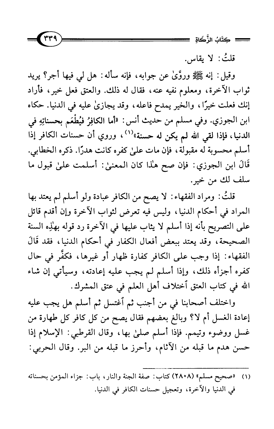 قلتُ: ومراد الفقهاء: لا يصح من الكافر عبادة ولو أسلم لم يعتد بها المراد في أحكام الدنيا، وليس فيه تعرض لثواب الآخرة وإن أقدم قائل على التصريح بأنه إذا أسلم لا يثاب عليها في الآخرة رد قوله بهذِه السنة الصحيحة، وقد يعتد ببعض أفعال الكفار في أحكام الدنيا، فقد قَالَ الفقهاء: إذا وجب على الكافر كفارة ظهار أو غيرها، فكفَّر في حال كفره أجزأه ذلك، وإذا أسلم لم يجب عليه إعادته، وسيأتي إن شاء الله في كتاب العتق اختلاف أهل العلم في عتق المشرك.