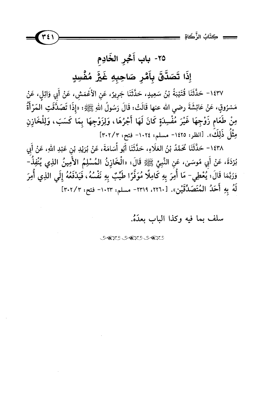 1437 - حَدَّثَنَا قُتَيْبَةُ بْنُ سَعِيدٍ، حَدَّثَنَا جَرِيرٌ، عَنِ الأَعْمَشِ، عَنْ أَبِي وَائِلٍ، عَنْ مَسْرُوقٍ، عَنْ عَائِشَةَ رضي الله عنها قَالَتْ: قَالَ رَسُولُ اللهِ - صلى الله عليه وسلم -: "إِذَا تَصَدَّقَتِ المَرْأَةُ مِنْ طَعَامِ زَوْجِهَا غَيْرَ مُفْسِدَةٍ كَانَ لَهَا أَجْرُهَا، وَلِزَوْجِهَا بِمَا كَسَبَ، وَلِلْخَازِنِ مِثْلُ ذَلِكَ". [انظر: 1425 - مسلم: 1024 - فتح: 3/ 302]