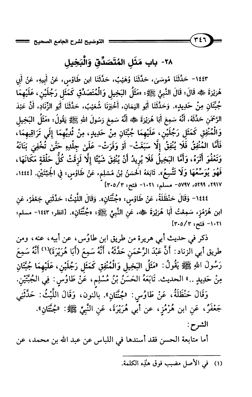 1443 - حَدَّثَنَا مُوسَى، حَدَّثَنَا وُهَيْبٌ، حَدَّثَنَا ابْنُ طَاوُسٍ، عَنْ أَبِيهِ، عَنْ أَبِي هُرَيْرَةَ - رضي الله عنه - قَالَ: قَالَ النَّبِيُّ - صلى الله عليه وسلم -: "مَثَلُ البَخِيلِ وَالمُتَصَدِّقِ كَمَثَلِ رَجُلَيْنِ، عَلَيْهِمَا جُبَّتَانِ مِنْ حَدِيدٍ". وَحَدَّثَنَا أَبُو اليَمَانِ، أَخْبَرَنَا شُعَيْبٌ، حَدَّثَنَا أَبُو الزِّنَادِ، أَنَّ عَبْدَ الرَّحْمَنِ حَدَّثَهُ، أَنَّهُ سَمِعَ أَبَا هُرَيْرَةَ - رضي الله عنه - أَنَّهُ سَمِعَ رَسُولَ اللهِ - صلى الله عليه وسلم - يَقُولُ: "مَثَلُ البَخِيلِ وَالمُنْفِقِ كَمَثَلِ رَجُلَيْنِ، عَلَيْهِمَا جُبَّتَانِ مِنْ حَدِيدٍ، مِنْ ثُدِيِّهِمَا إِلَي تَرَاقِيهِمَا، فَأَمَّا المُنْفِقُ فَلاَ يُنْفِقُ إِلاَّ سَبَغَتْ -أَوْ وَفَرَتْ- عَلَى جِلْدِهِ حَتَّى تُخْفِيَ بَنَانَهُ وَتَعْفُوَ أَثَرَهُ، وَأَمَّا البَخِيلُ فَلاَ يُرِيدُ أَنْ يُنْفِقَ شَيْئًا إِلاَّ لَزِقَتْ كُلُّ حَلْقَةٍ مَكَانَهَا، فَهُوَ يُوَسِّعُهَا وَلاَ تَتَّسِعُ". تَابَعَهُ الحَسَنُ بْنُ مُسْلِمٍ، عَنْ طَاوُسٍ: فِي الجُبَّتَيْنِ. [1444، 2917، 5299، 5797 - مسلم: 1021 - فتح: 3/ 305]