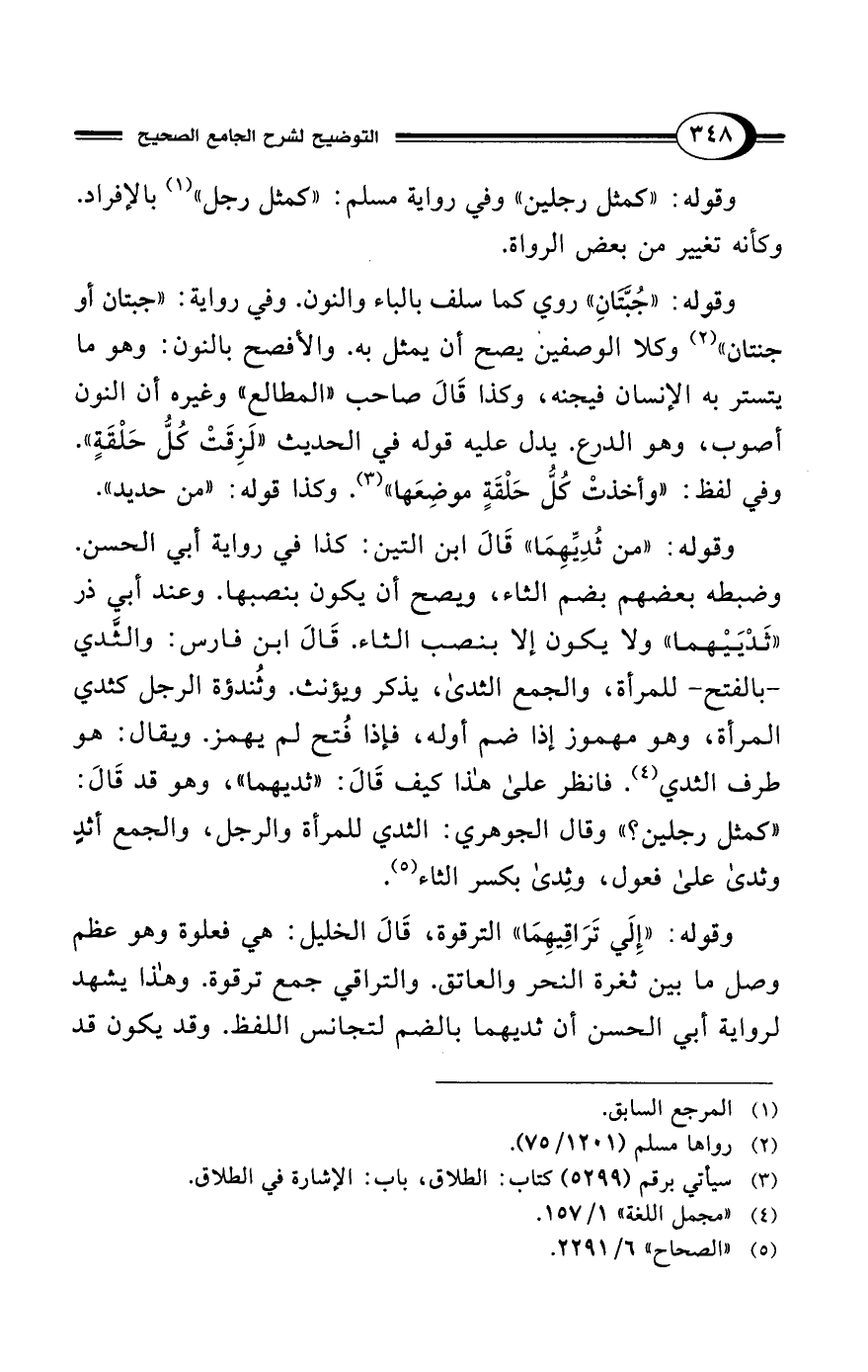 وضبطه بعضهم بضم الثاء، ويصح أن يكون بنصبها. وعند أبي ذر "ثَدْيَيْهما" ولا يكون إلا بنصب الثاء. قَالَ ابن فارس: والثَّدي -بالفتح- للمرأة، والجمع الثدى، يذكر ويؤنث. وثُندؤة الرجل كثدي المرأة، وهو مهموز إذا ضم أوله، فإذا فُتح لم يهمز. ويقال: هو طرف الثدي (¬4). فانظر على هذا كيف قَالَ: "ثديهما"، وهو قد قَالَ: "كمثل رجلين؟ " وقال الجوهري: الثدي للمرأة والرجل، والجمع أثدٍ وثدى على فعول، وثِدى بكسر الثاء (¬5).