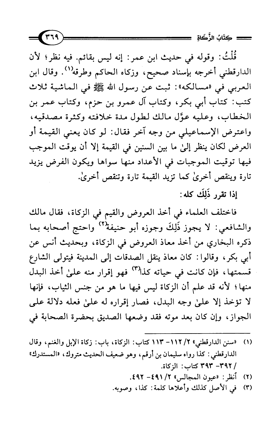 قُلْتُ: وقوله في حديث ابن عمر: إنه ليس بقائم. فيه نظر؛ لأن الدارقطني أخرجه بإسناد صحيح، وزكاه الحاكم وطرقه (¬1). وقال ابن العربي في "مسالكه": ثبت عن رسول الله - صلى الله عليه وسلم - في الماشية ثلاث كتب: كتاب أبي بكر، وكتاب آل عمرو بن حزم، وكتاب عمر بن الخطاب، وعليه عوَّل مالك لطول مدة خلافته وكثرة مصدقيه، واعترض الإسماعيلي من وجه آخر فقال: لو كان يعني القيمة أو العرض لكان ينظر إلى ما بين السنين في القيمة إلا أن يوقت الموجب فيها توقيت الموجبات في الأعداد منها سواها ويكون الفرض يزيد تارة وينقص أخرى كما تزيد القيمة تارة وتنقص أخرى.