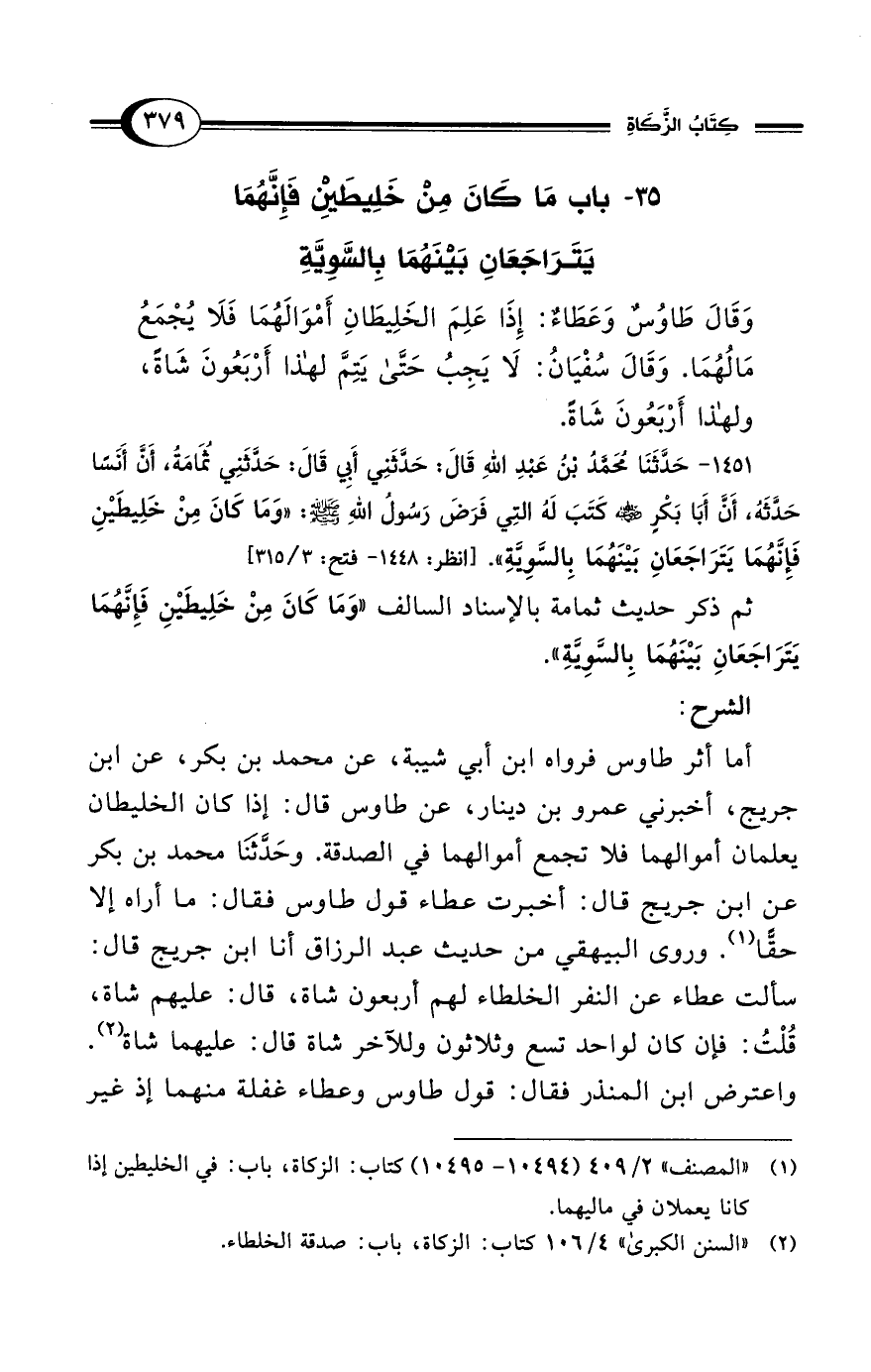 (¬2) "السنن الكبرى" 4/ 106 كتاب: الزكاة، باب: صدقة الخلطاء.