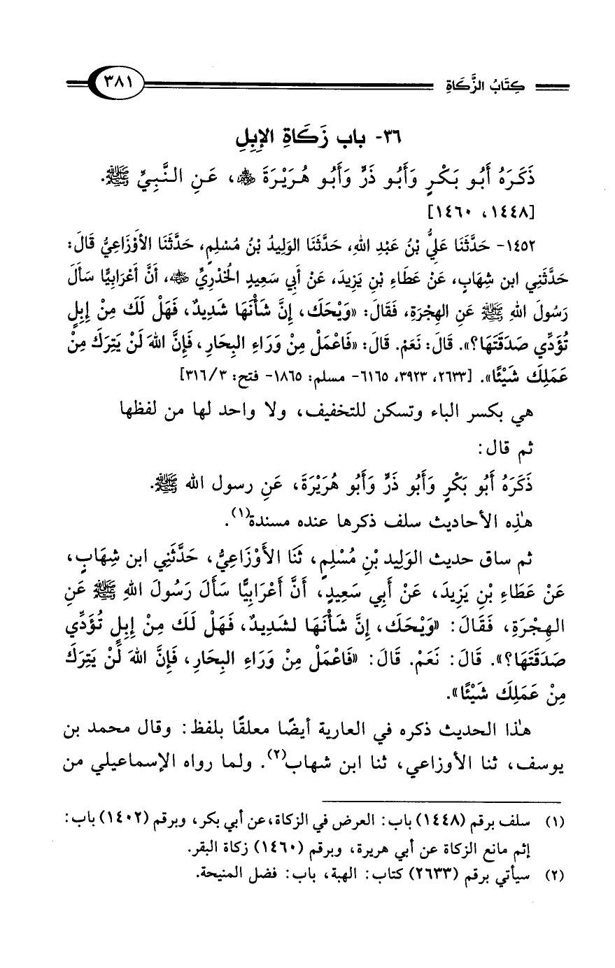 (¬1) سلف برقم (1448) باب: العرض في الزكاة، عن أبي بكر، وبرقم (1402) باب: إثم مانع الزكاة عن أبي هريرة، وبرقم (1460) زكاة البقر.