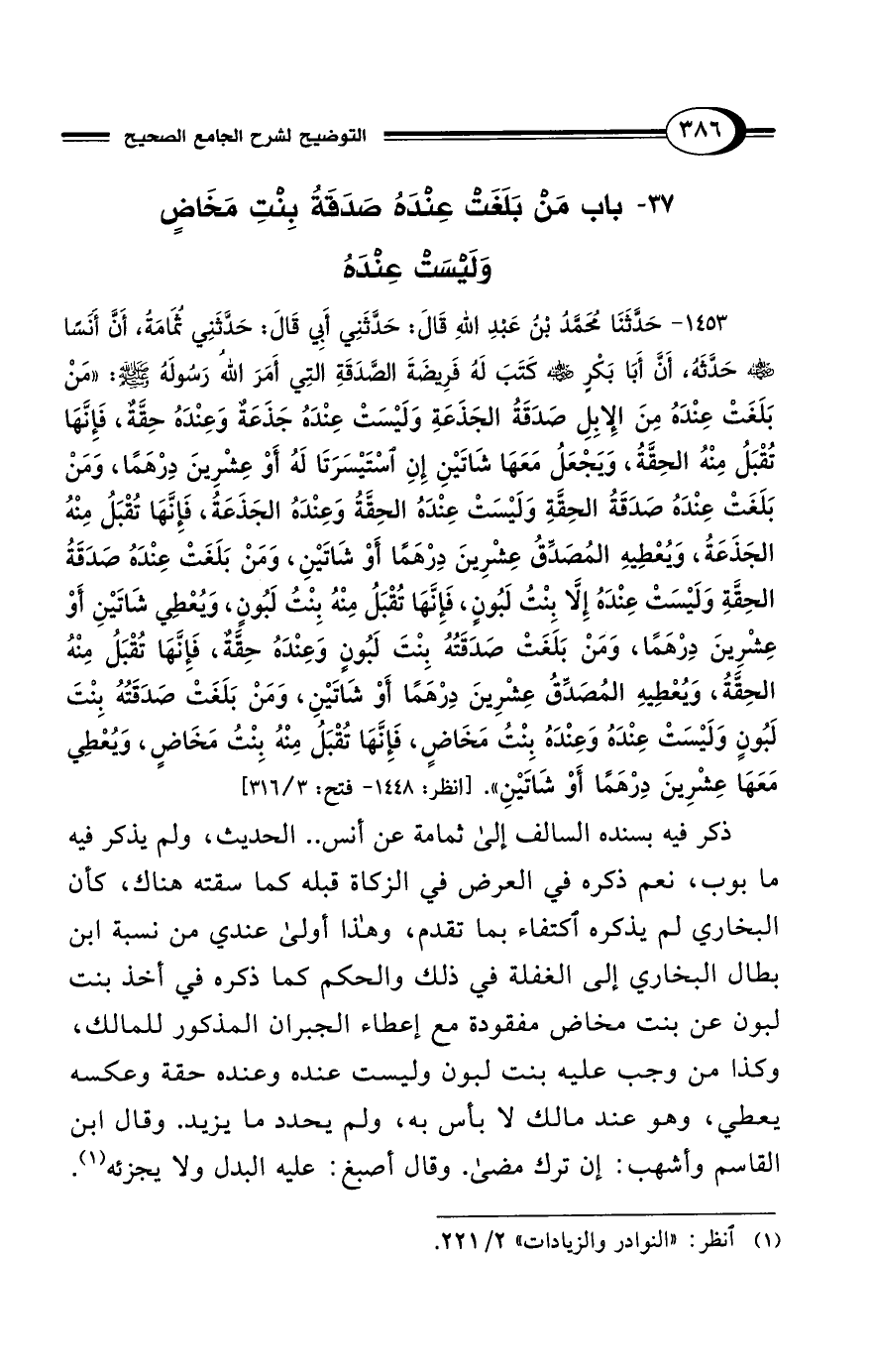 1453 - حَدَّثَنَا مُحَمَّدُ بْنُ عَبْدِ اللهِ قَالَ: حَدَّثَنِي أَبِي قَالَ: حَدَّثَنِي ثُمَامَةُ أَنَّ أَنَسًا - رضي الله عنه - حَدَّثَهُ، أَنَّ أَبَا بَكْرٍ - رضي الله عنه - كَتَبَ لَهُ فَرِيضَةَ الصَّدَقَةِ التِي أَمَرَ اللهُ رَسُولَهُ - صلى الله عليه وسلم -: "مَنْ بَلَغَتْ عِنْدَهُ مِنَ الإِبِلِ صَدَقَةُ الجَذَعَةِ، وَلَيْسَتْ عِنْدَهُ جَذَعَةٌ وَعِنْدَهُ حِقَّةٌ، فَإِنَّهَا تُقْبَلُ مِنْهُ الحِقَّةُ، وَيَجْعَلُ مَعَهَا شَاتَيْنِ إِنِ اسْتَيْسَرَتَا لَهُ أَوْ عِشْرِينَ دِرْهَمًا، وَمَنْ بَلَغَتْ عِنْدَهُ صَدَقَةُ الحِقَّةِ وَلَيْسَتْ عِنْدَهُ الحِقَّةُ وَعِنْدَهُ الجَذَعَةُ، فَإِنَّهَا تُقْبَلُ مِنْهُ الجَذَعَةُ، وَيُعْطِيهِ المُصَدِّقُ عِشْرِينَ دِرْهَمًا أَوْ شَاتَيْنِ، وَمَنْ بَلَغَتْ عِنْدَهُ صَدَقَةُ الحِقَّةِ وَلَيْسَتْ عِنْدَهُ إِلاَّ بِنْتُ لَبُونٍ، فَإِنَّهَا تُقْبَلُ مِنْهُ بِنْتُ لَبُونٍ، وَيُعْطِي شَاتَيْنِ أَوْ عِشْرِينَ دِرْهَمًا، وَمَنْ بَلَغَتْ صَدَقَتُهُ بِنْتَ لَبُونٍ وَعِنْدَهُ حِقَّةٌ، فَإِنَّهَا تُقْبَلُ مِنْهُ الحِقَّةُ، وَيُعْطِيهِ المُصَدِّقُ عِشْرِينَ دِرْهَمًا أَوْ شَاتَيْنِ، وَمَنْ بَلَغَتْ صَدَقَتُهُ بِنْتَ لَبُونٍ وَلَيْسَتْ عِنْدَهُ وَعِنْدَهُ بِنْتُ مَخَاضٍ، فَإِنَّهَا تُقْبَلُ مِنْهُ بِنْتُ مَخَاضٍ، وَيُعْطِي مَعَهَا عِشْرِينَ دِرْهَمًا أَوْ شَاتَيْنِ". [انظر: 1448 - فتح: 3/ 316]