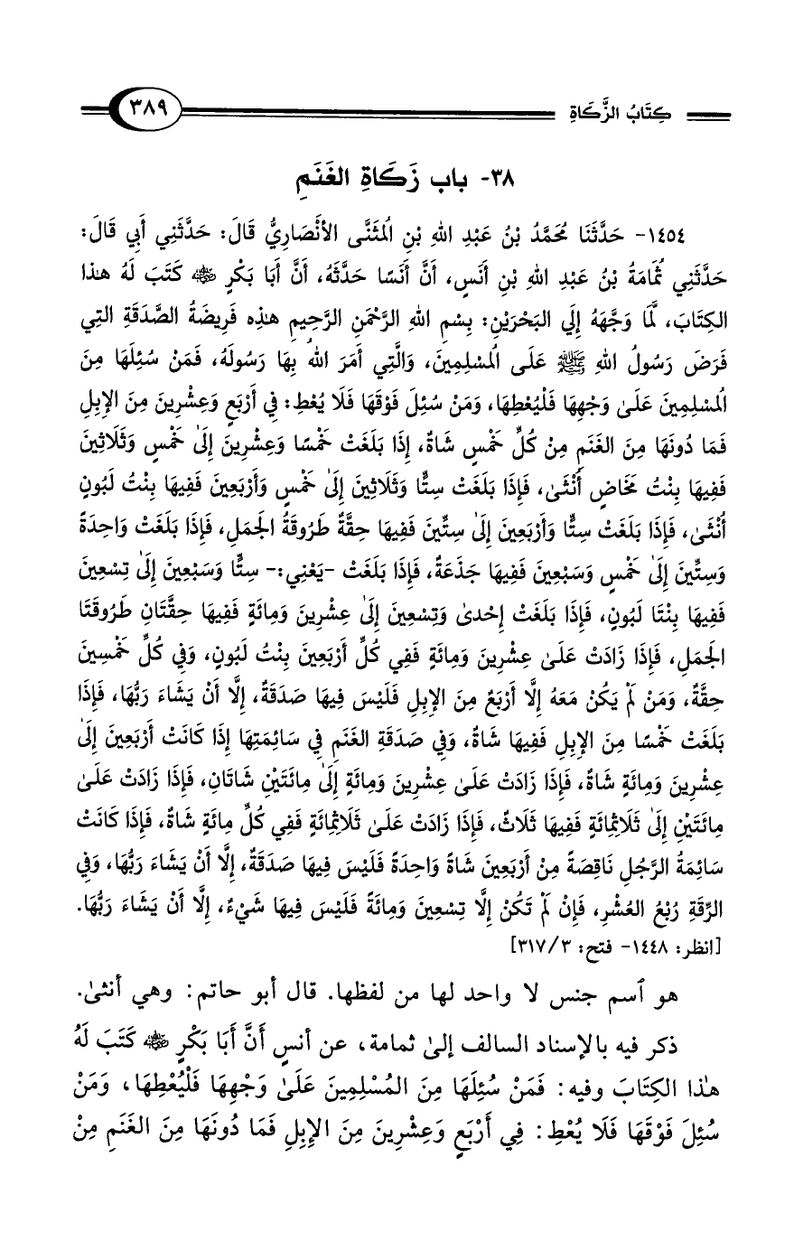 1454 - حَدَّثَنَا مُحَمَّدُ بْنُ عَبْدِ اللهِ بْنِ المُثَنَّى الأَنْصَارِيُّ قَالَ: حَدَّثَنِي أَبِي قَالَ: حَدَّثَنِي ثُمَامَةُ بْنُ عَبْدِ اللهِ بْنِ أَنَسٍ، أَنَّ أَنَسًا حَدَّثَهُ، أَنَّ أَبَا بَكْرٍ - رضي الله عنه - كَتَبَ لَهُ هَذَا الكِتَابَ، لَمَّا وَجَّهَهُ إِلَي البَحْرَيْنِ: بِسْمِ اللهِ الرَّحْمَنِ الرَّحِيمِ هَذِهِ فَرِيضَةُ الصَّدَقَةِ التِي فَرَضَ رَسُولُ اللهِ - صلى الله عليه وسلم - عَلَى المُسْلِمِينَ، وَالتِي أَمَرَ اللهُ بِهَا رَسُولَهُ، فَمَنْ سُئِلَهَا مِنَ المُسْلِمِينَ عَلَى وَجْهِهَا فَلْيُعْطِهَا، وَمَنْ سُئِلَ فَوْقَهَا فَلاَ يُعْطِ: فِي أَرْبَعٍ وَعِشْرِينَ مِنَ الإِبِلِ فَمَا دُونَهَا مِنَ الغَنَمِ مِنْ كُلِّ خَمْسٍ شَاةٌ، إِذَا بَلَغَتْ خَمْسًا وَعِشْرِينَ إِلَى خَمْسٍ وَثَلاَثِينَ فَفِيهَا بِنْتُ مَخَاضٍ أُنْثَى، فَإِذَا بَلَغَتْ سِتًّا وَثَلاَثِينَ إِلَى خَمْسٍ وَأَرْبَعِينَ فَفِيهَا بِنْتُ لَبُونٍ أُنْثَى، فَإِذَا بَلَغَتْ سِتًّا وَأَرْبَعِينَ إِلَى سِتِّينَ فَفِيهَا حِقَّةٌ طَرُوقَةُ الجَمَلِ، فَإِذَا بَلَغَتْ وَاحِدَةً وَسِتِّينَ إِلَى خَمْسٍ وَسَبْعِينَ فَفِيهَا جَذَعَةٌ، فَإِذَا بَلَغَتْ -يَعْنِى:- سِتًّا وَسَبْعِينَ إِلَى تِسْعِينَ فَفِيهَا بِنْتَا لَبُونٍ، فَإِذَا بَلَغَتْ إِحْدَى وَتِسْعِينَ إِلَى عِشْرِينَ وَمِائَةٍ فَفِيهَا حِقَّتَانِ طَرُوقَتَا الجَمَلِ، فَإِذَا زَادَتْ عَلَى عِشْرِينَ وَمِائَةٍ فَفِى كُلِّ أَرْبَعِينَ بِنْتُ لَبُونٍ، وَفِي كُلِّ خَمْسِينَ حِقَّةٌ، وَمَنْ لَمْ يَكُنْ مَعَهُ إِلاَّ أَرْبَعٌ مِنَ الإِبِلِ فَلَيْسَ فِيهَا صَدَقَةٌ، إِلاَّ أَنْ يَشَاءَ رَبُّهَا، فَإِذَا بَلَغَتْ خَمْسًا مِنَ الإِبِلِ فَفِيهَا شَاةٌ، وَفِي صَدَقَةِ الغَنَمِ فِي سَائِمَتِهَا إِذَا كَانَتْ أَرْبَعِينَ إِلَى عِشْرِينَ وَمِائَةٍ شَاةٌ، فَإِذَا زَادَتْ عَلَى عِشْرِينَ وَمِائَةٍ إِلَى مِائَتَيْنِ شَاتَانِ، فَإِذَا زَادَتْ عَلَى مِائَتَيْنِ إِلَى ثَلاَثِمِائَةٍ فَفِيهَا ثَلاَثٌ، فَإِذَا زَادَتْ عَلَى ثَلاَثِمِائَةٍ فَفِي كُلِّ مِائَةٍ شَاةٌ، فَإِذَا كَانَتْ سَائِمَةُ الرَّجُلِ نَاقِصَةً مِنْ أَرْبَعِينَ شَاةً وَاحِدَةً فَلَيْسَ فِيهَا صَدَقَةٌ، إِلاَّ أَنْ يَشَاءَ رَبُّهَا، وَفِي الرِّقَةِ رُبْعُ العُشْرِ، فَإِنْ لَمْ تَكُنْ إِلاَّ تِسْعِينَ وَمِائَةً فَلَيْسَ فِيهَا شَيْءٌ، إِلاَّ أَنْ يَشَاءَ رَبُّهَا". [انظر: 1448 - فتح: 3/ 317]