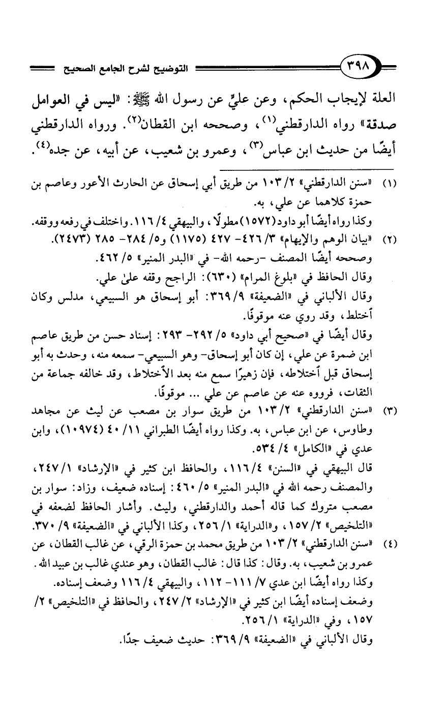 العلة لإيجاب الحكم، وعن عليٍّ عن رسول الله - صلى الله عليه وسلم -: "ليس في العوامل صدقة" رواه الدارقطني (¬1)، وصححه ابن القطان (¬2). ورواه الدارقطني أيضًا من حديث ابن عباس (¬3)، وعمرو بن شعيب، عن أبيه، عن جده (¬4).