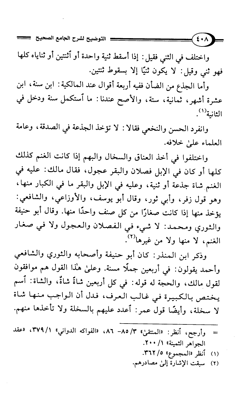 وأما الجذع من الضأن ففيه أربعة أقوال عند المالكية: ابن سنة، ابن عشرة أشهر، ثمانية، ستة، والأصح عندنا: ما استكمل سنة ودخل في الثانية (¬1).
