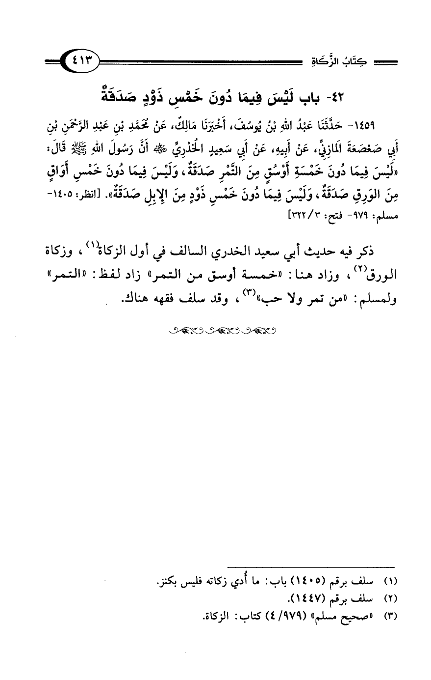 1459 - حَدَّثَنَا عَبْدُ اللهِ بْنُ يُوسُفَ، أَخْبَرَنَا مَالِكٌ، عَنْ مُحَمَّدِ بْنِ عَبْدِ الرَّحْمَنِ بْنِ أَبِي صَعْصَعَةَ المَازِنِيِّ، عَنْ أَبِيهِ عَنْ أَبِي سَعِيدٍ الخُدْرِيِّ - رضي الله عنه - أَنَّ رَسُولَ اللهِ - صلى الله عليه وسلم - قَالَ: "لَيْسَ فِيمَا دُونَ خَمْسَةِ أَوْسُقٍ مِنَ التَّمْرِ صَدَقَةٌ، وَلَيْسَ فِيمَا دُونَ خَمْسِ أَوَاقٍ مِنَ الوَرِقِ صَدَقَةٌ، وَلَيْسَ فِيمَا دُونَ خَمْسِ ذَوْدٍ مِنَ الإِبِلِ صَدَقَةٌ". [انظر: 1405 - مسلم: 979 - فتح: 3/ 322]