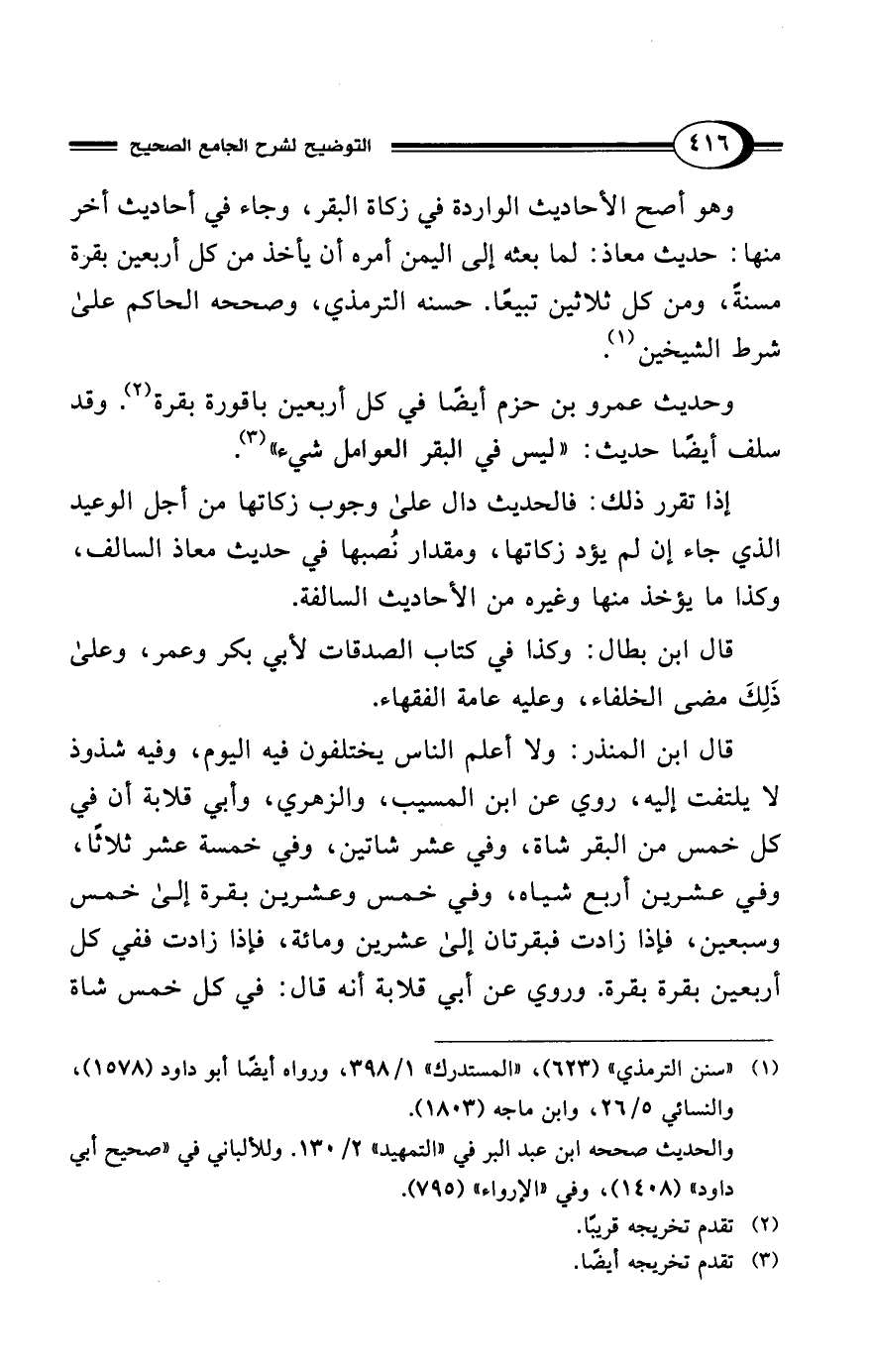 وهو أصح الأحاديث الواردة في زكاة البقر، وجاء في أحاديث أخر منها: حديث معاذ: لما بعثه إلى اليمن أمره أن يأخذ من كل أربعين بقرة مسنةً، ومن كل ثلاثين تبيعًا. حسنه الترمذي، وصححه الحاكم على شرط الشيخين (¬1).