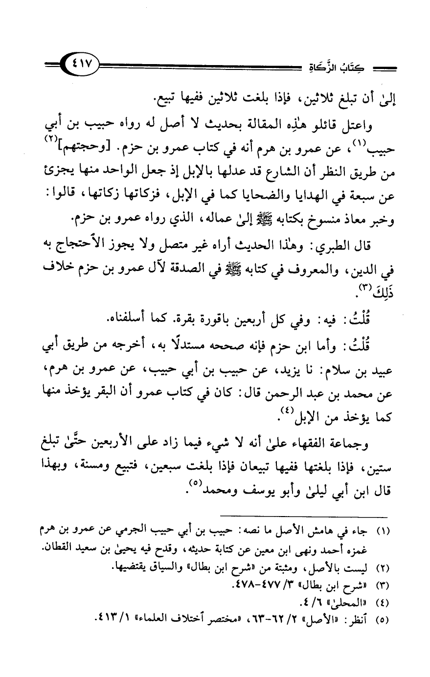 قُلْتُ: وأما ابن حزم فإنه صححه مستدلًا به، أخرجه من طريق أبي عبيد بن سلام: نا يزيد، عن حبيب بن أبي حبيب، عن عمرو بن هرم، عن محمد بن عبد الرحمن قال: كان في كتاب عمرو أن البقر يؤخذ منها كما يؤخذ من الإبل (¬4).