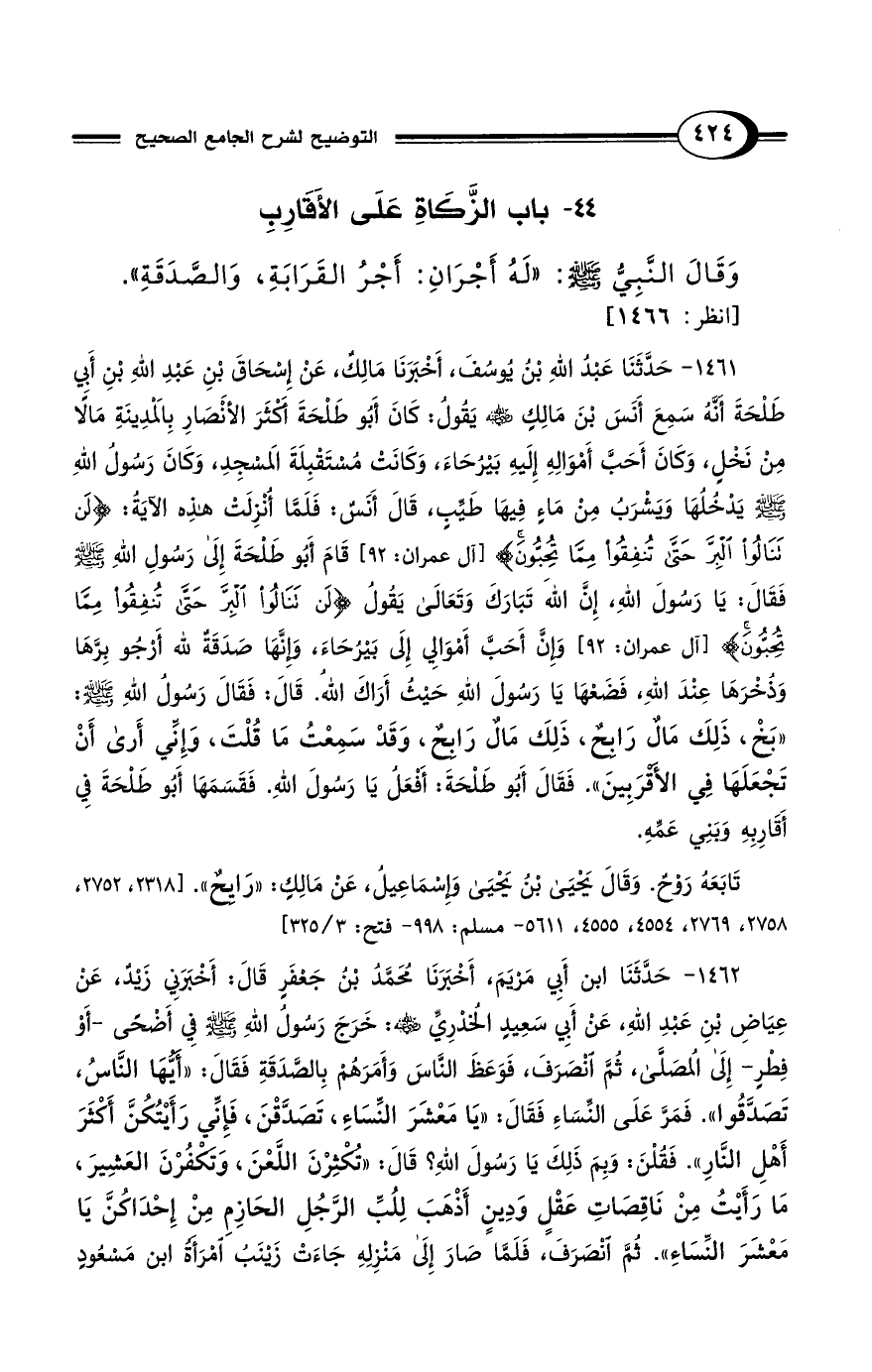 1461 - حَدَّثَنَا عَبْدُ اللهِ بْنُ يُوسُفَ، أَخْبَرَنَا مَالِكٌ، عَنْ إِسْحَاقَ بْنِ عَبْدِ اللهِ بْنِ أَبِي طَلْحَةَ أَنَّهُ سَمِعَ أَنَسَ بْنَ مَالِكٍ - رضي الله عنه - يَقُولُ: كَانَ أَبُو طَلْحَةَ أَكْثَرَ الأَنْصَارِ بِالمَدِينَةِ مَالًا مِنْ نَخْلٍ، وَكَانَ أَحَبَّ أَمْوَالِهِ إِلَيْهِ بَيْرُحَاءَ، وَكَانَتْ مُسْتَقْبِلَةَ المَسْجِدِ، وَكَانَ رَسُولُ اللهِ - صلى الله عليه وسلم - يَدْخُلُهَا وَيَشْرَبُ مِنْ مَاءٍ فِيهَا طَيِّبٍ، قَالَ أَنَسٌ: فَلَمَّا أُنْزِلَتْ هَذِهِ الآيَةُ: {لَنْ تَنَالُوا البِرَّ حَتَّى تُنْفِقُوا مِمَّا تُحِبُّونَ} [آل عمران: 92] قَامَ أَبُو طَلْحَةَ إِلَى رَسُولِ اللهِ - صلى الله عليه وسلم - فَقَالَ: يَا رَسُولَ اللهِ. إِنَّ اللهَ تَبَارَكَ وَتَعَالَى يَقُولُ {لَنْ تَنَالُوا البِرَّ حَتَّى تُنْفِقُوا مِمَّا تُحِبُّونَ} [آل عمران: 92] وَإِنَّ أَحَبَّ أَمْوَالِي إِلَىَّ بَيْرُحَاءَ، وَإِنَّهَا صَدَقَةٌ لله أَرْجُو بِرَّهَا وَذُخْرَهَا عِنْدَ اللهِ، فَضَعْهَا يَا رَسُولَ اللهِ حَيْثُ أَرَاكَ اللهُ. قَالَ: فَقَالَ رَسُولُ اللهِ - صلى الله عليه وسلم -: "بَخْ، ذَلِكَ مَالٌ رَابِحٌ، ذَلِكَ مَالٌ رَابِحٌ، وَقَدْ سَمِعْتُ مَا قُلْتَ، وَإِنِّي أَرَى أَنْ تَجْعَلَهَا فِي الأَقْرَبِينَ". فَقَالَ أَبُو طَلْحَةَ: أَفْعَلُ يَا رَسُولَ اللهِ. فَقَسَمَهَا أَبُو طَلْحَةَ فِي أَقَارِبِهِ وَبَنِي عَمِّهِ.