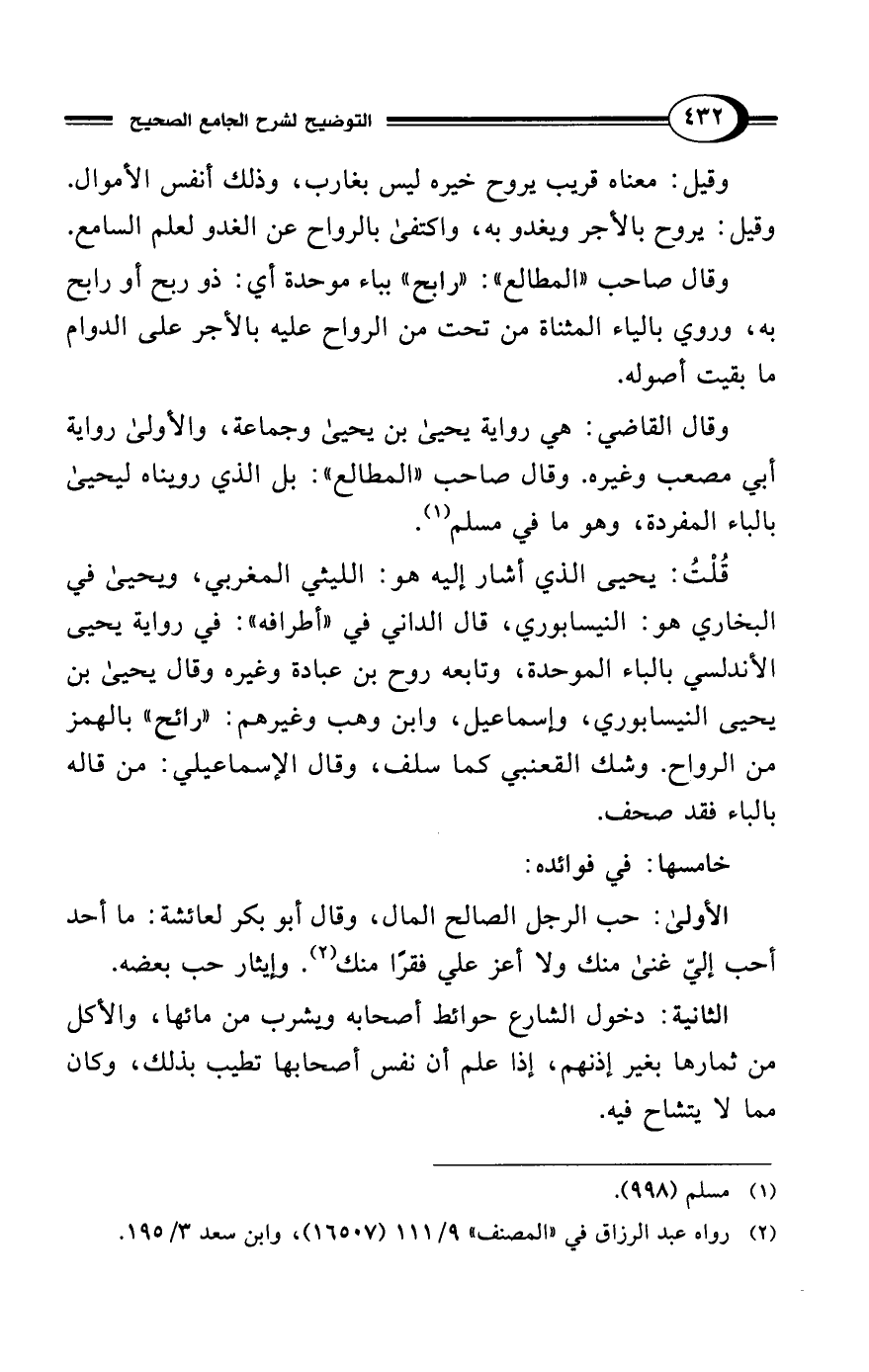 قُلْتُ: يحيى الذي أشار إليه هو: الليثي المغربي، ويحيى في البخاري هو: النيسابوري، قال الداني في "أطرافه": في رواية يحيى الأندلسي بالباء الموحدة، وتابعه روح بن عبادة وغيره وقال يحيى بن يحيى النيسابوري، وإسماعيل، وابن وهب وغيرهم: "رائح" بالهمز من الرواح. وشك القعنبي كما سلف، وقال الإسماعيلي: من قاله بالباء فقد صحف.