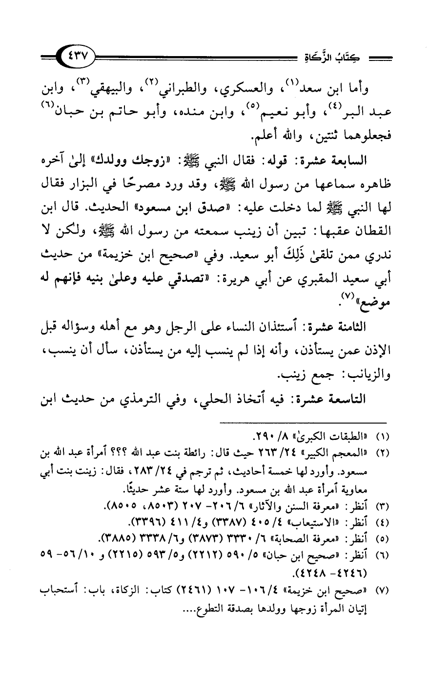 (¬7) "صحيح ابن خزيمة" 4/ 106 - 107 (2461) كتاب: الزكاة، باب: استحباب إتيان المرأة زوجها وولدها بصدقة التطوع ....