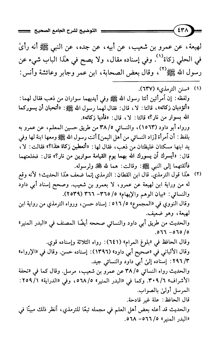 لهيعة، عن عمرو بن شعيب، عن أبيه، عن جده، عن النبي - صلى الله عليه وسلم - أنه رأى في الحلي زكاة (¬1). وفي إسناده مقال، ولا يصح في هذا الباب شيء عن رسول الله - صلى الله عليه وسلم - (¬2)، وقال بعض الصحابة، ابن عمر وجابر وعائشة وأنس: