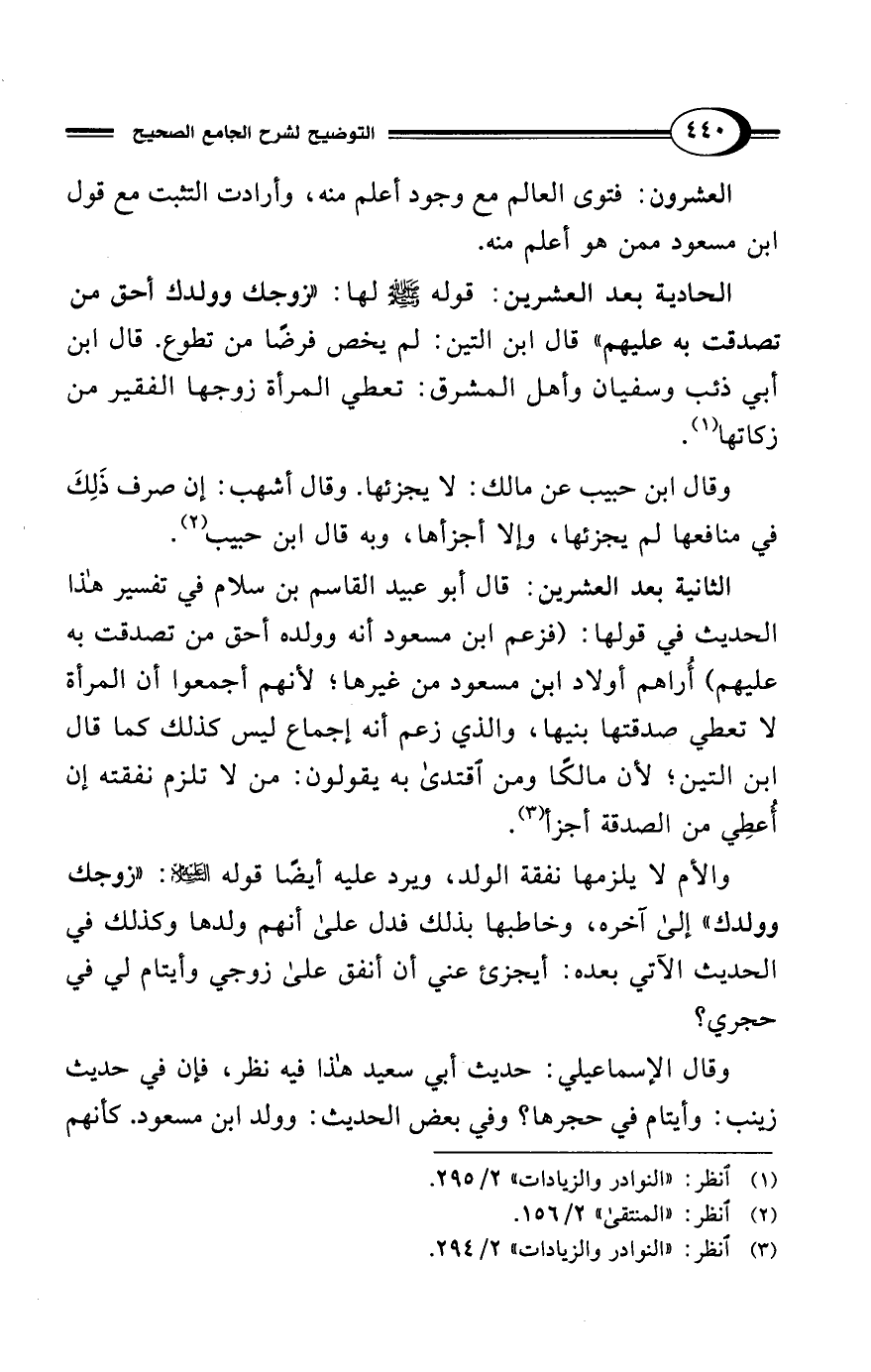 الثانية بعد العشرين: قال أبو عبيد القاسم بن سلام في تفسير هذا الحديث في قولها: (فزعم ابن مسعود أنه وولده أحق من تصدقت به عليهم) أُراهم أولاد ابن مسعود من غيرها؛ لأنهم أجمعوا أن المرأة لا تعطي صدقتها بنيها، والذي زعم أنه إجماع ليس كذلك كما قال ابن التين؛ لأن مالكًا ومن اقتدى به يقولون: من لا تلزم نفقته إن أُعطِي من الصدقة أجزأ (¬3).