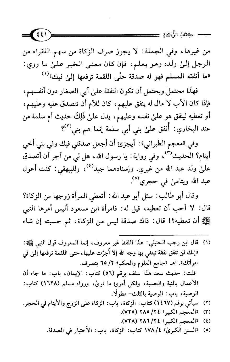 فهذا محتمل ويحتمل أن تكون النفقة على أبي الصغار دون أنفسهم، فإذا كان الأب لا مال له ينفق عليهم، كان للأم أن تتصدق عليه وعليهم، أو تعطيه لينفق هو على نفسه وعليهم، يدل على ذَلِكَ حديث أم سلمة من عند البخاري: أُنفق على بني أبي سلمة إنما هم بني (¬2)؟