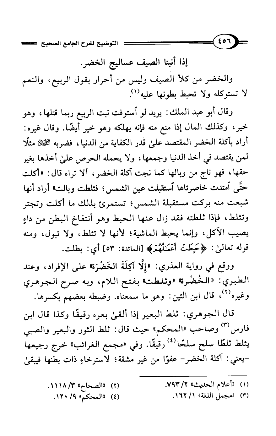 وقال أبو عبد الملك: يريد لو استوفت نبت الربيع ربما قتلها، وهو خير، وكذلك المال إذا منع منه فإنه يهلكه وهو خير أيضًا. وقال غيره: أراد بآكلة الخضر المقتصد على قدر الكفاية من الدنيا، فضربه - عليه السلام - مثلًا لمن يقتصد في أخذ الدنيا وجمعها، ولا يحمله الحرص على أخذها بغير حقها، فهو ناج من وبالها كما نجت آكلة الخضر، ألا تراه قال: "أكلت حتَّى امتدت خاصرتاها استقبلت عين الشمس؛ فثلطت وبالت" أراد أنها شبعت منه بركت مستقبلة الشمس؛ تستمرئ بذلك ما أكلت وتجتر وتثلط، فإذا ثلطته فقد زال عنها الحبط وهو انتفاخ البطن من داءٍ يصيب الآكل، وإنما يحبط الماشية؛ لأنها لا تثلط، ولا تبول، ومنه قوله تعالى: {حَبِطَتْ أَعْمَالُهُمْ} [المائدة: 53] أي: بطلت.