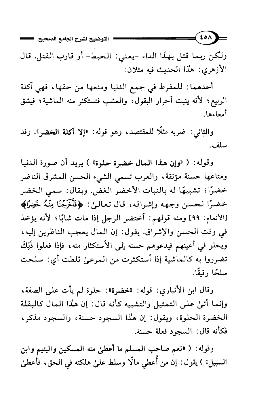 ولكن ربما قتل بهذا الداء -يعني: الحبط- أو قارب القتل. قال الأزهري: هذا الحديث فيه مثلان: