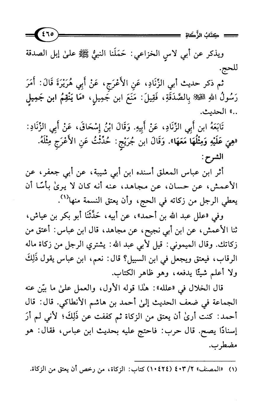 قال الخلال في "علله": هذا قوله الأول، والعمل على ما بيّن عنه الجماعة في ضعف الحديث إلى أحمد بن هاشم الأنطاكي. قال: قال أحمد: كنت أرى أن يعتق من الزكاة ثم كففت عن ذَلِكَ؛ لأني لم أرَ إسنادًا يصح. قال حرب: فاحتج عليه بحديث ابن عباس، فقال: هو مضطرب.