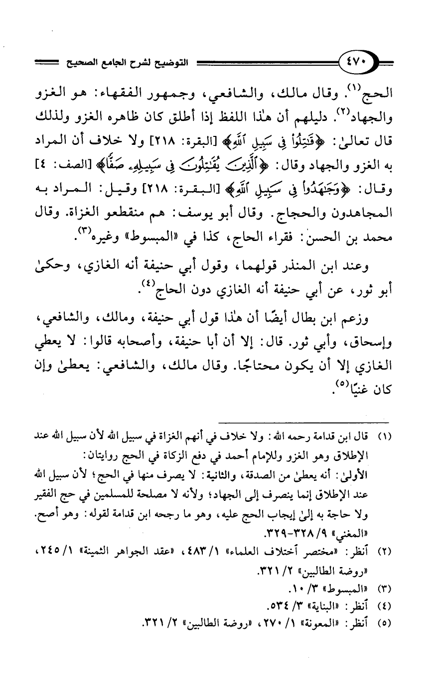 (¬1) قال ابن قدامة رحمه الله: ولا خلاف في أنهم الغزاة في سبيل الله لأن سبيل الله عند الإطلاق وهو الغزو وللإمام أحمد في دفع الزكاة في الحج روايتان: