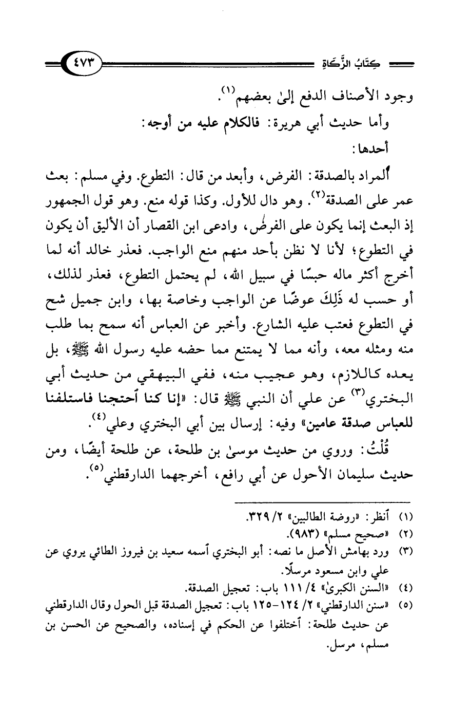 (¬5) "سنن الدارقطني" 2/ 124 - 125 باب: تعجيل الصدقة قبل الحول وقال الدارقطني عن حديث طلحة: اختلفوا عن الحكم في إسناده، والصحيح عن الحسن بن مسلم، مرسل.