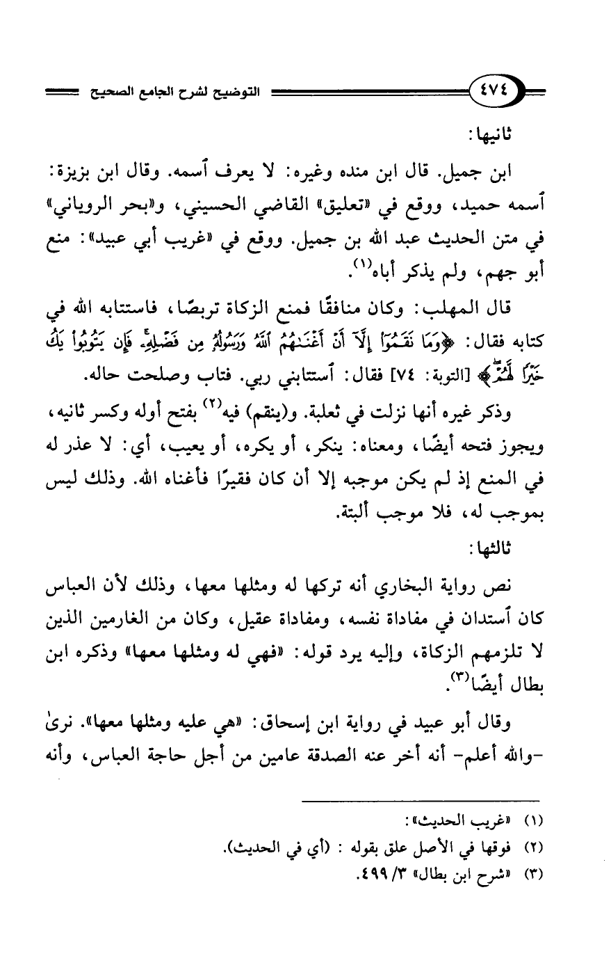 ابن جميل. قال ابن منده وغيره: لا يعرف اسمه. وقال ابن بزيزة: اسمه حميد، ووقع في "تعليق" القاضي الحسيني، و"بحر الروياني" في متن الحديث عبد الله بن جميل. ووقع في "غريب أبي عبيد": منع أبو جهم، ولم يذكر أباه (¬1).