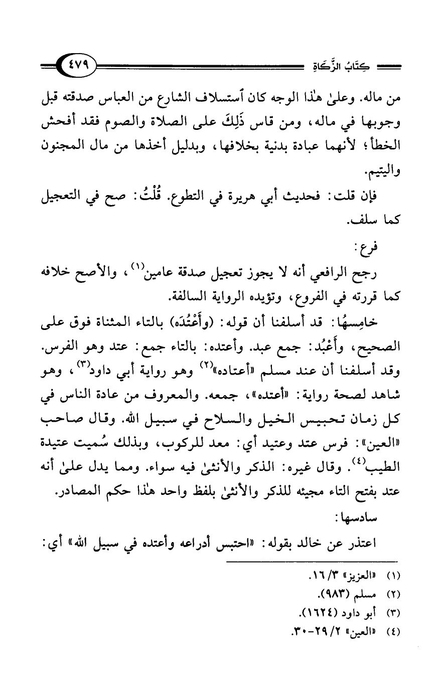 خامِسهُا: قد أسلفنا أن قوله: (وأَعْتُدَه) بالتاء المثناة فوق على الصحيح، وأَعْبُد: جمع عبد. وأعتده: بالتاء جمع: عند وهو الفرس.