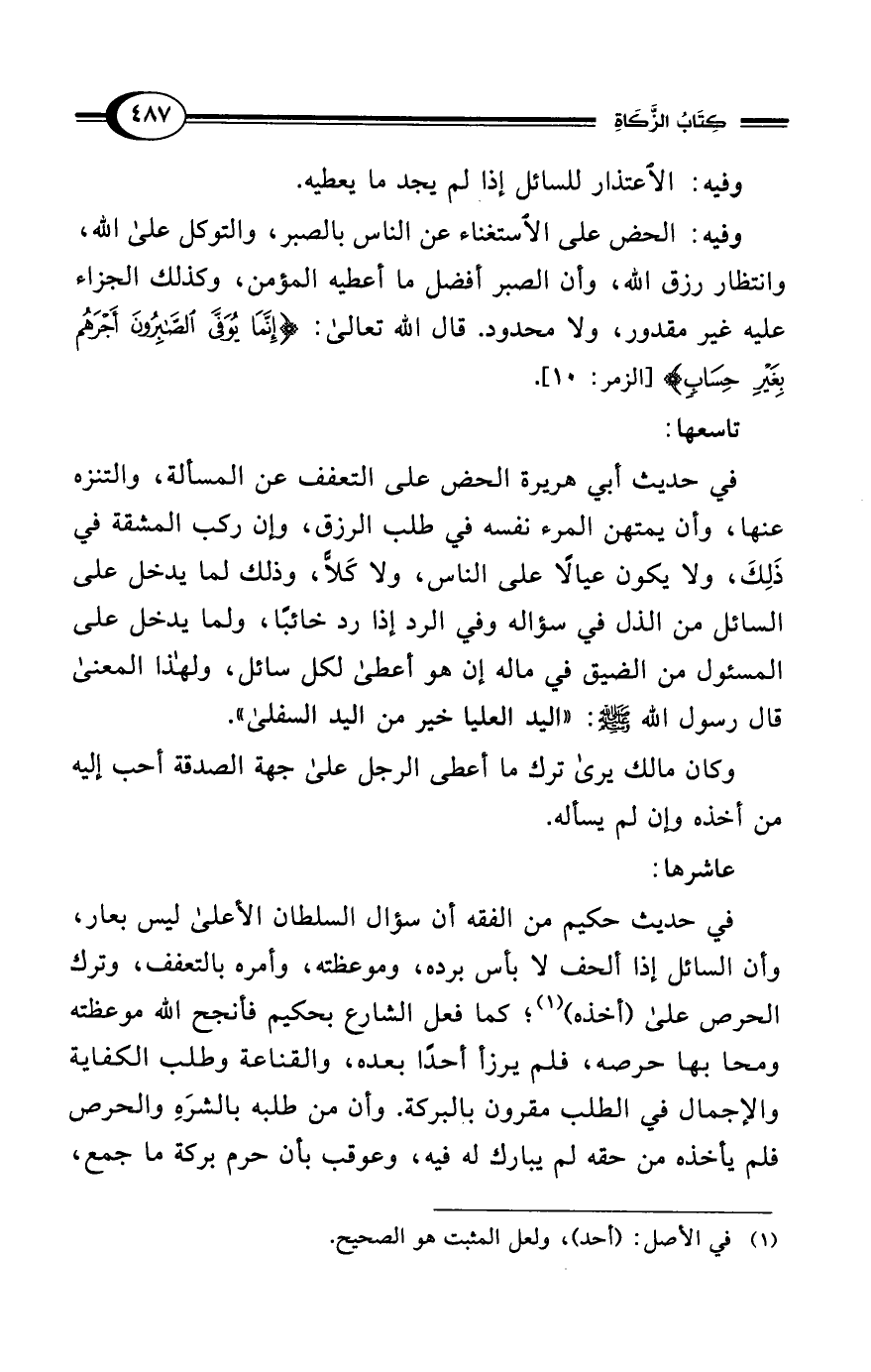 في حديث حكيم من الفقه أن سؤال السلطان الأعلى ليس بعار، وأن السائل إذا ألحف لا بأس برده، وموعظته، وأمره بالتعفف، وترك الحرص على (أخذه) (¬1)؛ كما فعل الشارع بحكيم فأنجح الله موعظته ومحا بها حرصه، فلم يرزأ أحدًا بعده، والقناعة وطلب الكفاية والإجمال في الطلب مقرون بالبركة. وأن من طلبه بالشرَهِ والحرص فلم يأخذه من حقه لم يبارك له فيه، وعوقب بأن حرم بركة ما جمع،