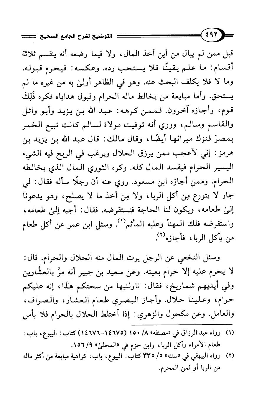 وسئل النخعي عن الرجل يرث المال منه الحلال والحرام. قال: لا يحرم عليه إلا حرام بعينه. وعن سعيد بن جبير أنه مرَّ بالعشَّارين وفي أيديهم شماريخ، فقال: ناولنيها من سحتكم هذا، إنه عليكم حرام، وعلينا حلال. وأجاز البصري طعام العشار، والصراف، والعامل. وعن مكحول والزهري: إذا اختلط الحلال بالحرام فلا بأس