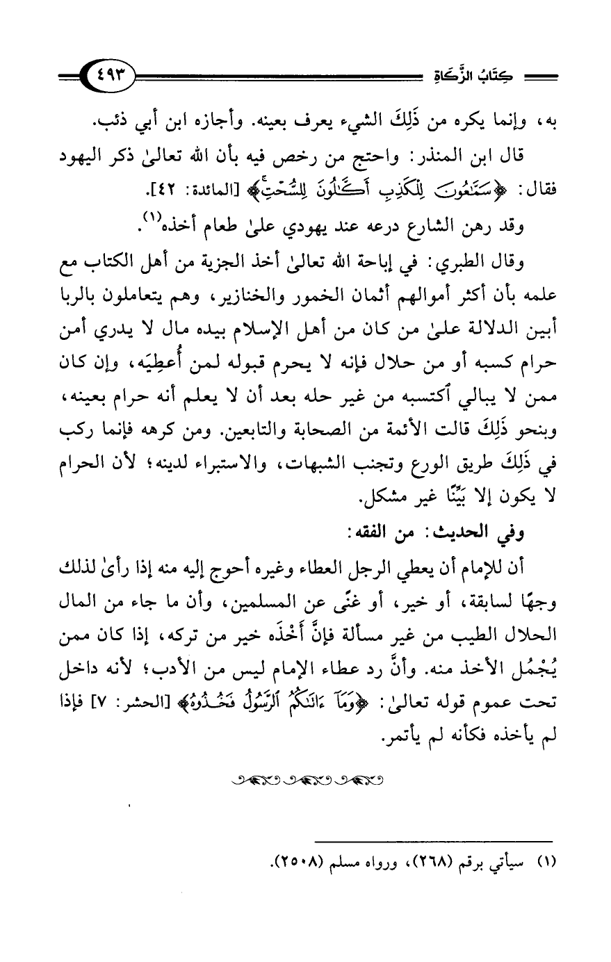 وقال الطبري: في إباحة الله تعالى أخذ الجزية من أهل الكتاب مع علمه بأن أكثر أموالهم أثمان الخمور والخنازير، وهم يتعاملون بالربا أبين الدلالة على من كان من أهل الإسلام بيده مال لا يدري أمن حرام كسبه أو من حلال فإنه لا يحرم قبوله لمن أُعطِيَه، وإن كان ممن لا يبالي اكتسبه من غير حله بعد أن لا يعلم أنه حرام بعينه، وبنحو ذَلِكَ قالت الأئمة من الصحابة والتابعين. ومن كرهه فإنما ركب في ذَلِكَ طريق الورع وتجنب الشبهات، والاستبراء لدينه؛ لأن الحرام لا يكون إلا بَيِّنًا غير مشكل.