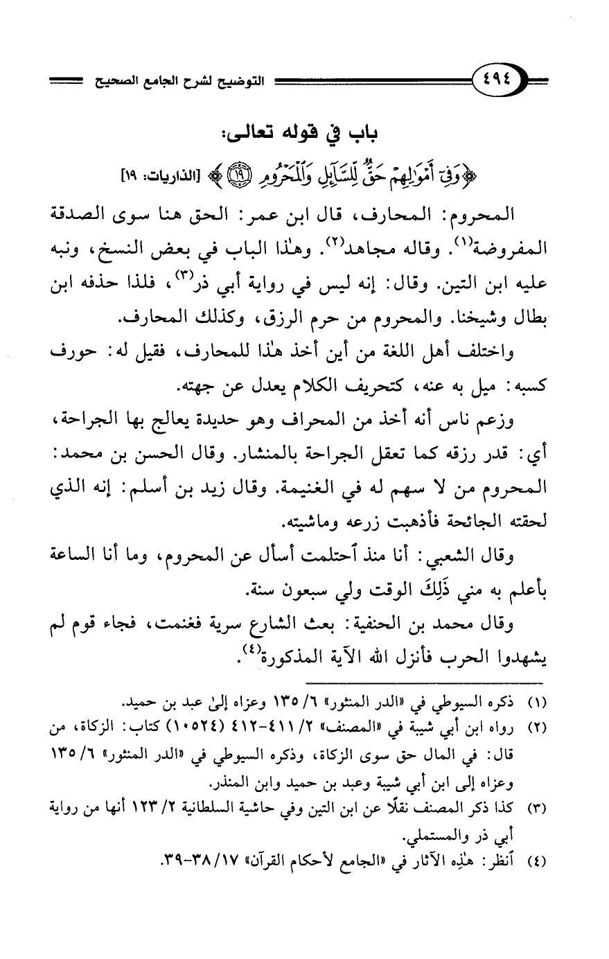 المحروم: المحارف، قال ابن عمر: الحق هنا سوى الصدقة المفروضة (¬1). وقاله مجاهد (¬2). وهذا الباب في بعض النسخ، ونبه عليه ابن التين. وقال: إنه ليس في رواية أبي ذر (¬3)، فلذا حذفه ابن بطال وشيخنا. والمحروم من حرم الرزق، وكذلك المحارف.