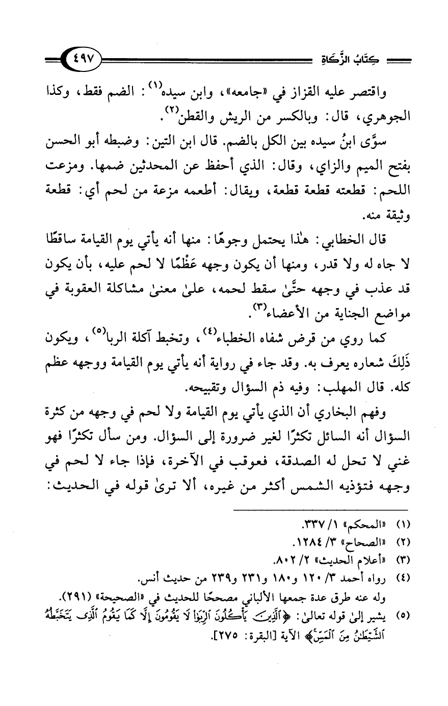 وفهم البخاري أن الذي يأتي يوم القيامة ولا لحم في وجهه من كثرة السؤال أنه السائل تكثرًا لغير ضرورة إلى السؤال. ومن سأل تكثرًا فهو غني لا تحل له الصدقة، فعوقب في الآخرة، فإذا جاء لا لحم في وجهه فتؤذيه الشمس أكثر من غيره، ألا ترى قوله في الحديث: