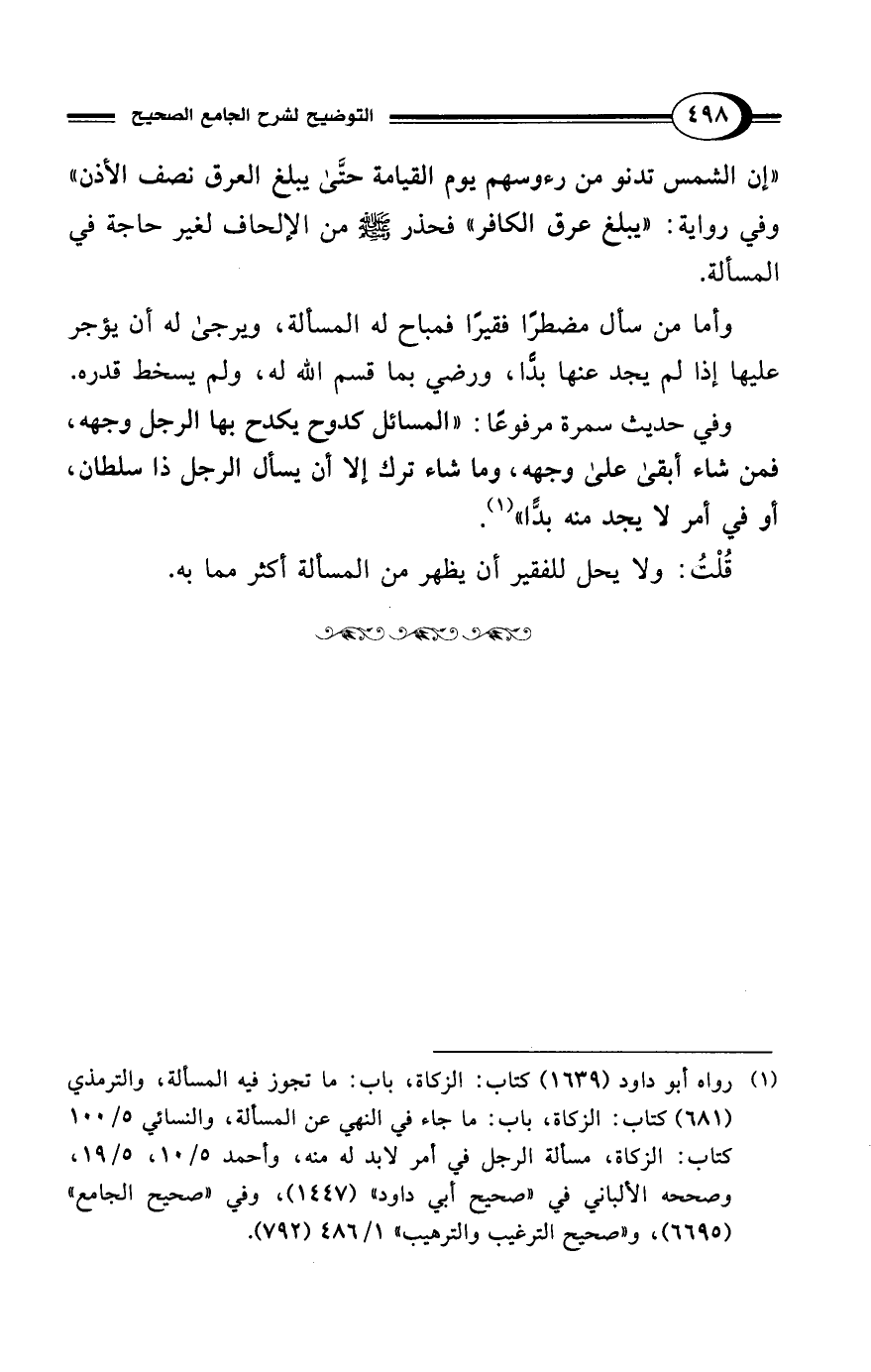 (¬1) رواه أبو داود (1639) كتاب: الزكاة، باب: ما تجوز فيه المسألة، والترمذي (681) كتاب: الزكاة، باب: ما جاء في النهي عن المسألة، والنسائي 5/ 100 كتاب: الزكاة، مسألة الرجل في أمر لا بد له منه، وأحمد 5/ 10، 5/ 19، وصححه الألباني في "صحيح أبي داود" (1447)، وفي "صحيح الجامع" (6695)، و"صحيح الترغيب والترهيب" 1/ 486 (792).