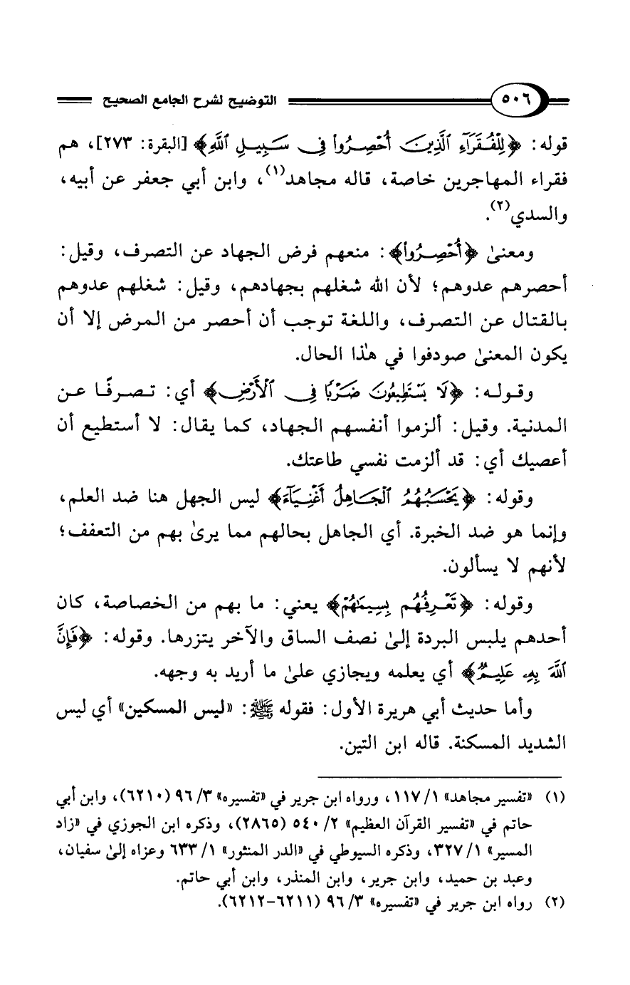 قوله: {لِلْفُقَرَاءِ الَّذِينَ أُحْصِرُوا فِي سَبِيلِ اللهِ} [البقرة: 273]، هم فقراء المهاجرين خاصة، قاله مجاهد (¬1)، وابن أبي جعفر عن أبيه، والسدي (¬2).
